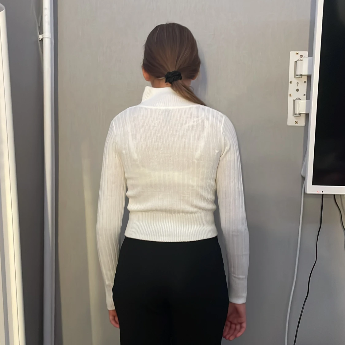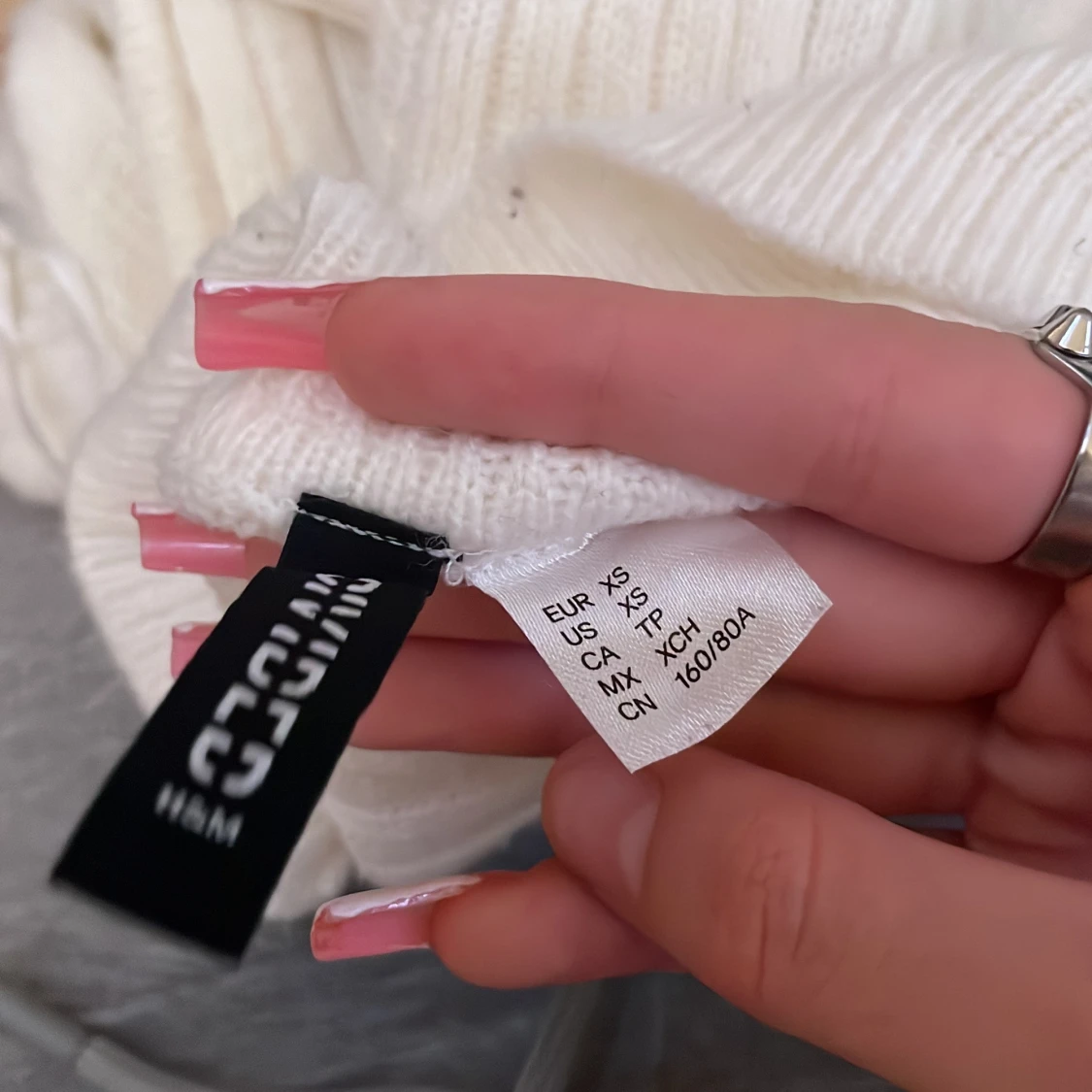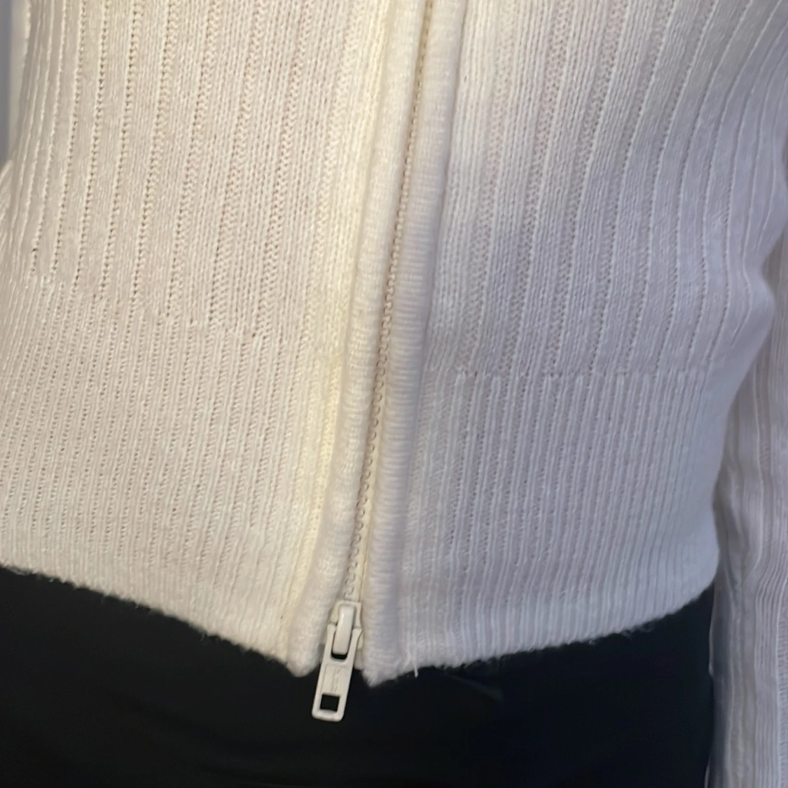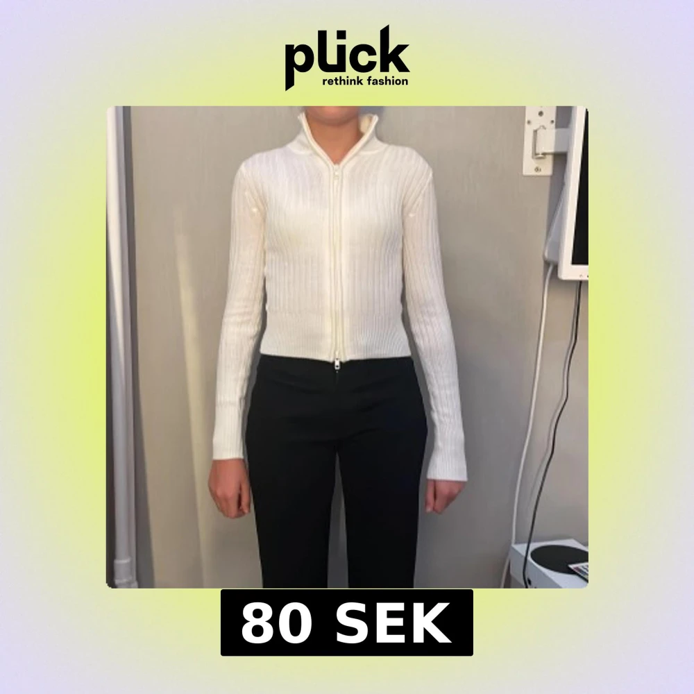 Säljer en vit ribbad kofta från H&M i storlek XS. Tröjan har lång ärm, hög krage och hel dragkedja framtill. Den är stickad i ett mjukt material och har en slim passform som sitter snyggt på kroppen. Perfekt till lager-på-lager och enkel att matcha.