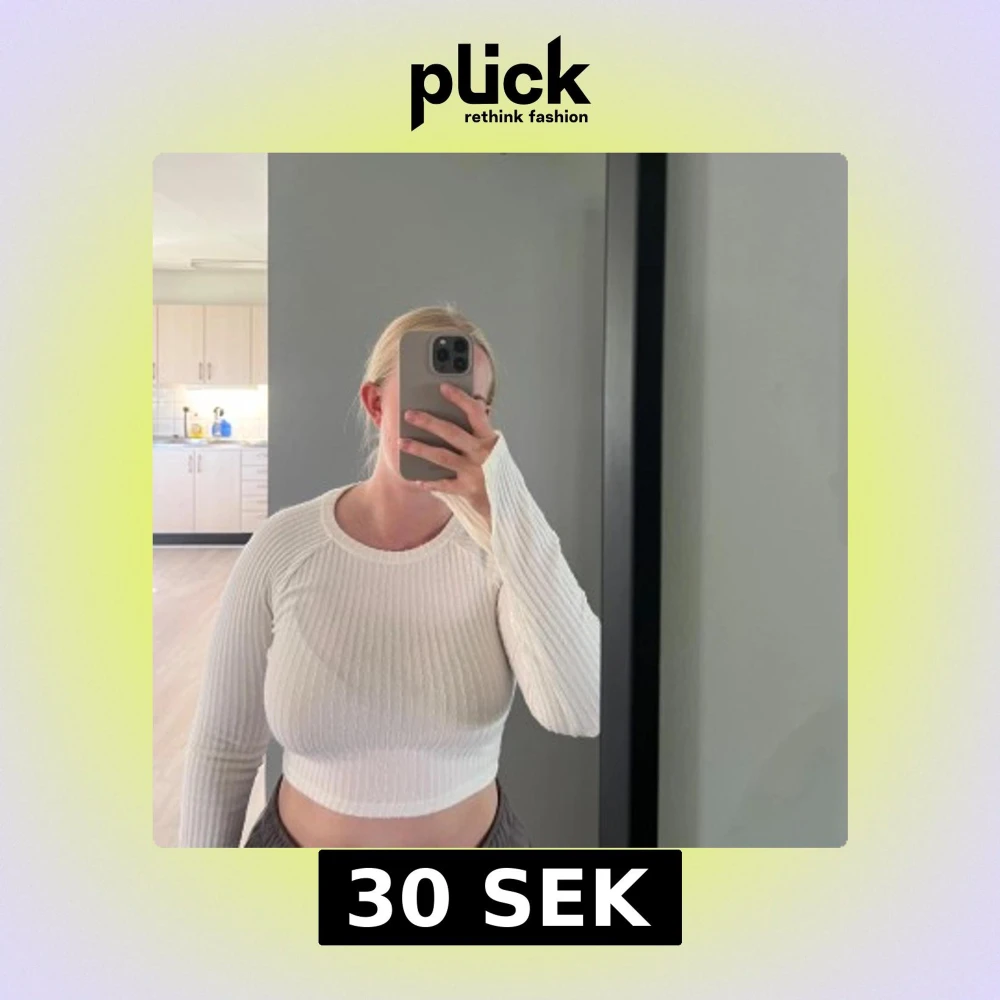 Säljer en vit ribbad långärmad croptop med rund halsringning. Tröjan är figurnära och har stretchigt material. Har slits vid ärmarna