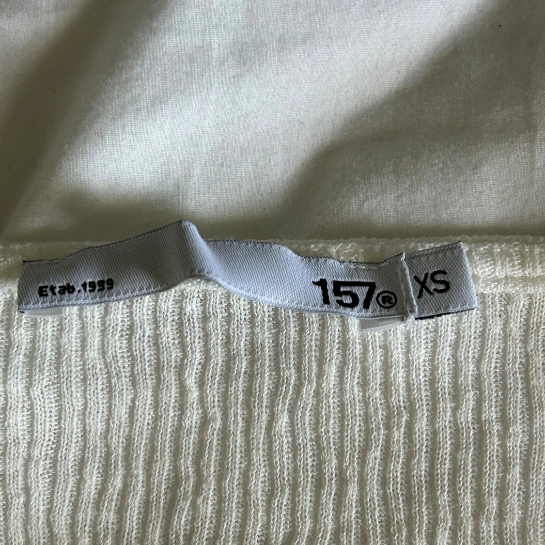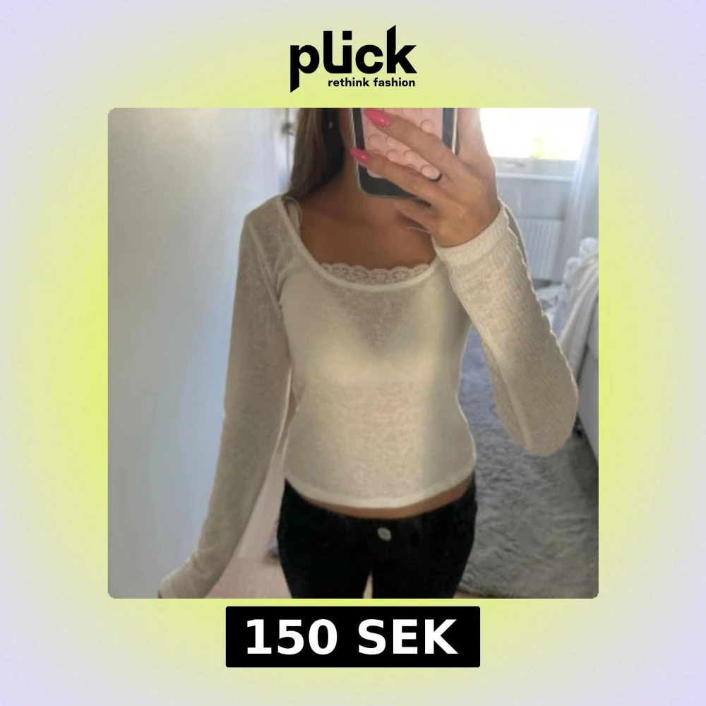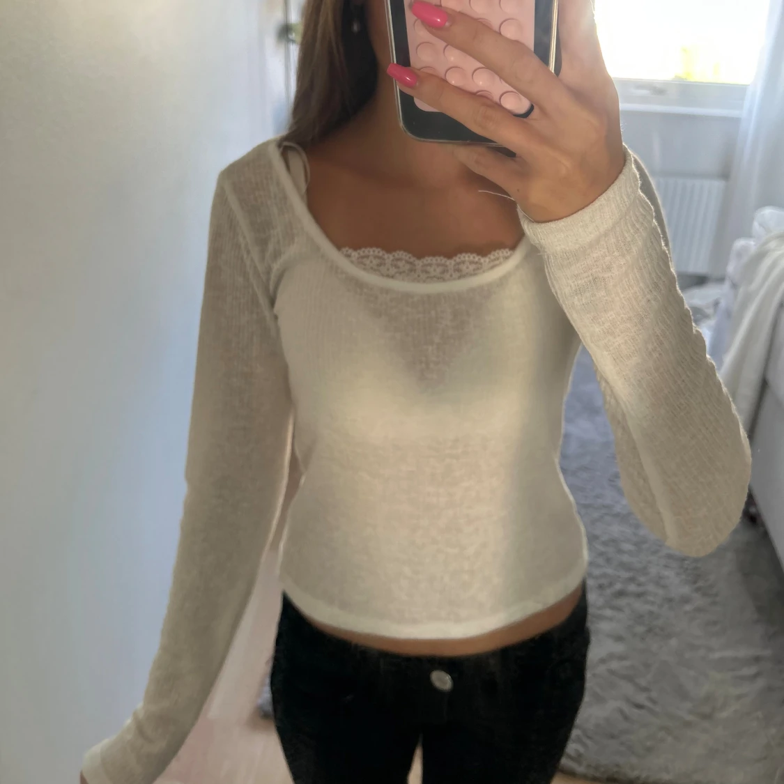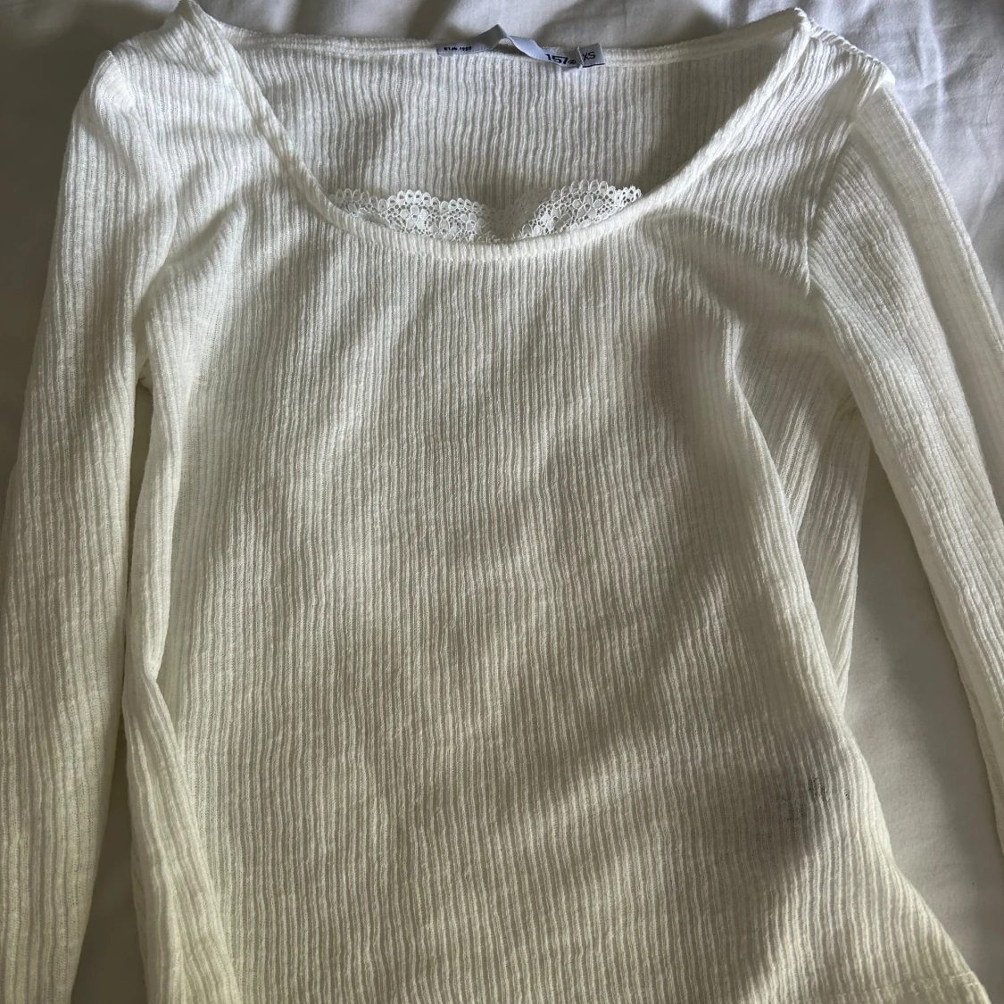Supersöt vit långärmad topp från 157 med ribbad struktur och spetsdetalj vid urringningen. Sitter tajt och har en feminin, enkel look som passar perfekt till jeans eller kjol. Tunn och mjuk i materialet, perfekt för lager-på-lager.