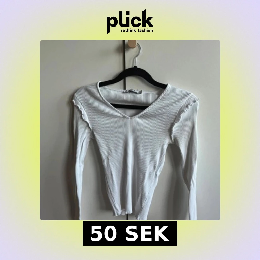 Säljer en vit ribbad långärmad topp från NA-KD i storlek XS. Toppen har v-ringning och små volangdetaljer vid axlarna. Perfekt att styla till olika outfits och passar året runt.