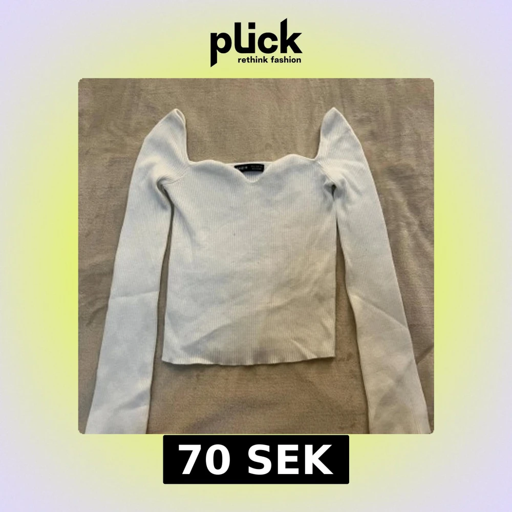 Säljer en vit ribbad långärmad topp från SHEIN med unik v-ringad halsringning och figurnära passform. Toppen har långa ärmar och är tillverkad i stretchigt material som sitter snyggt på kroppen.