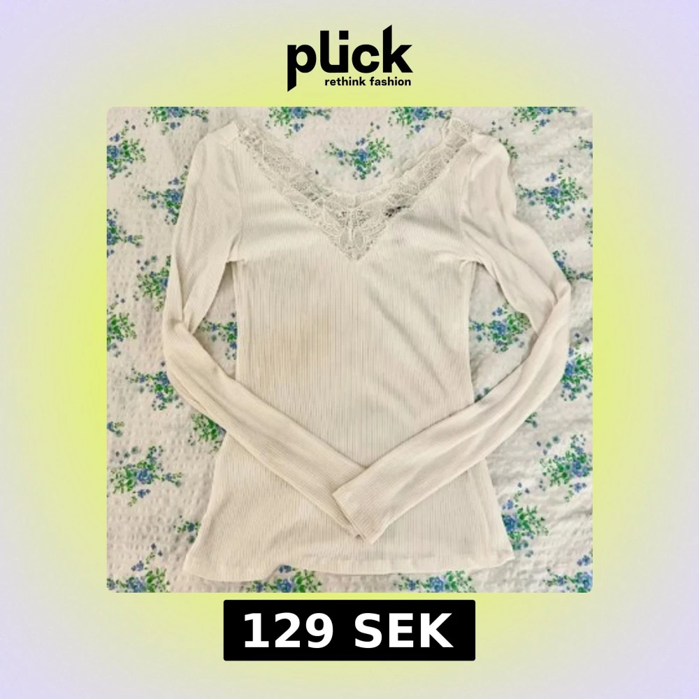 Säljer en stilren vit ribbad topp med vacker spetsdetalj vid halsringningen. Toppen har långa ärmar och en elegant v-ringning. Perfekt för en chic och bekväm look.