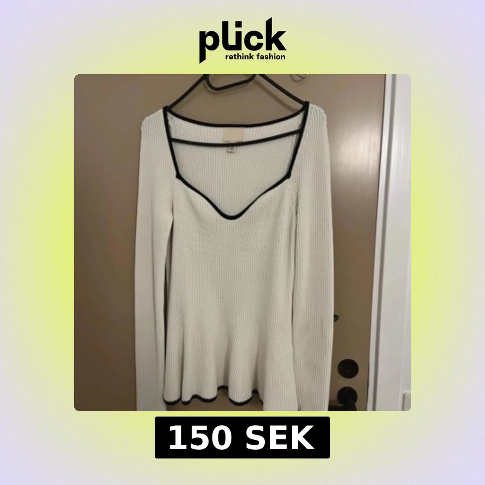 Säljer en vit ribbad långärmad tröja från H&M med svart kant längs halsringningen och nederkanten. Tröjan har en djup v-ringning och är figurnära med stretchigt material. Perfekt för en stilren och trendig look.