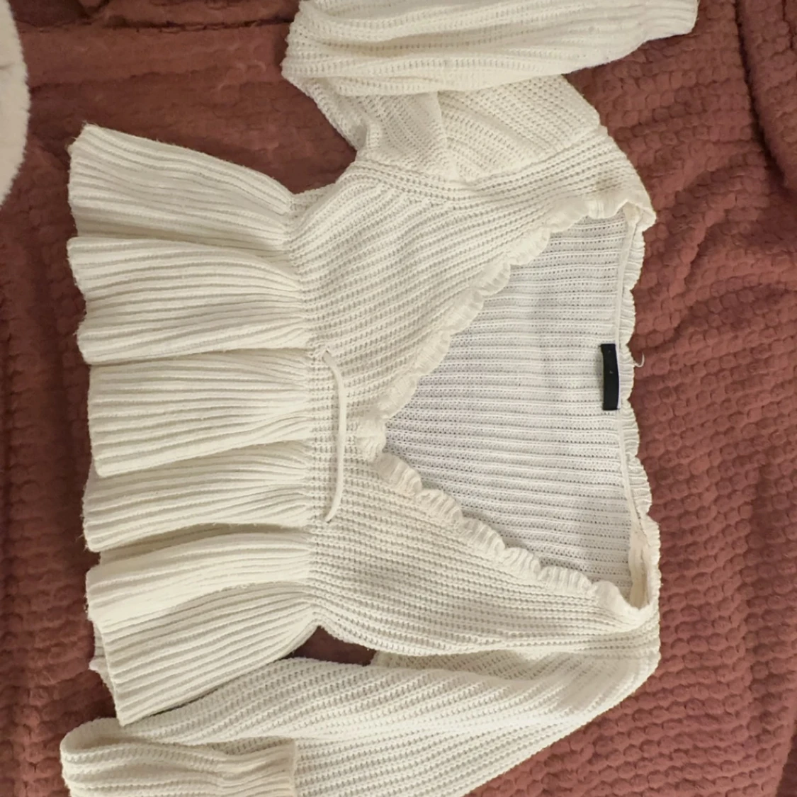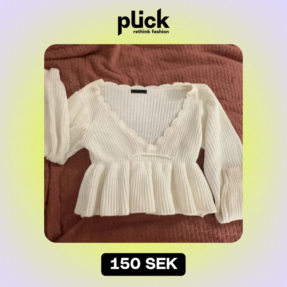 Säljer en söt vit ribbad omlottopp med volangdetaljer. Toppen har långa ärmar och en v-ringad design som ger en feminin touch. Perfekt för en stilren look.