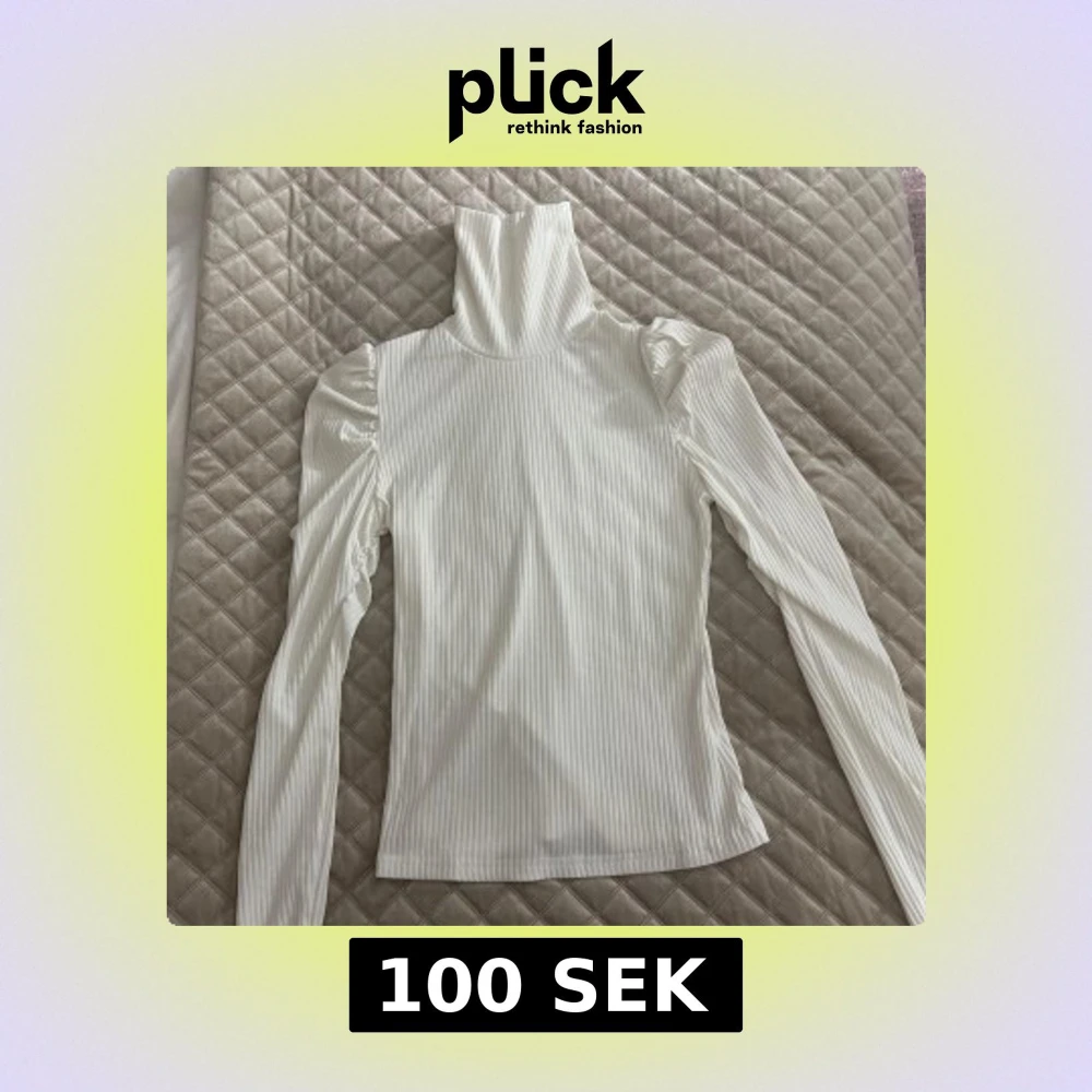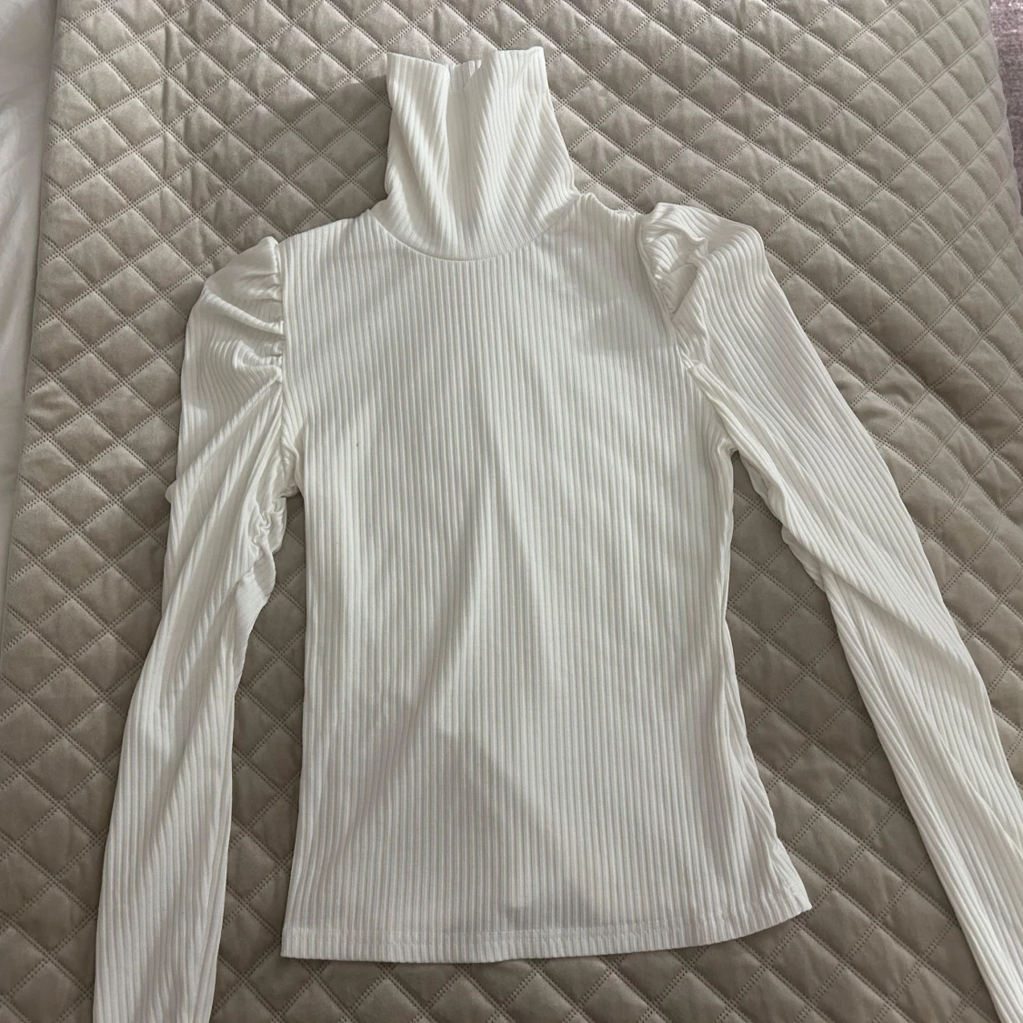 Säljer en vit ribbad polotröja med långa ärmar och puff vid axlarna. Tröjan har en hög polokrage och är figurnära i modellen. Perfekt att styla med jeans eller kjol för en clean look.