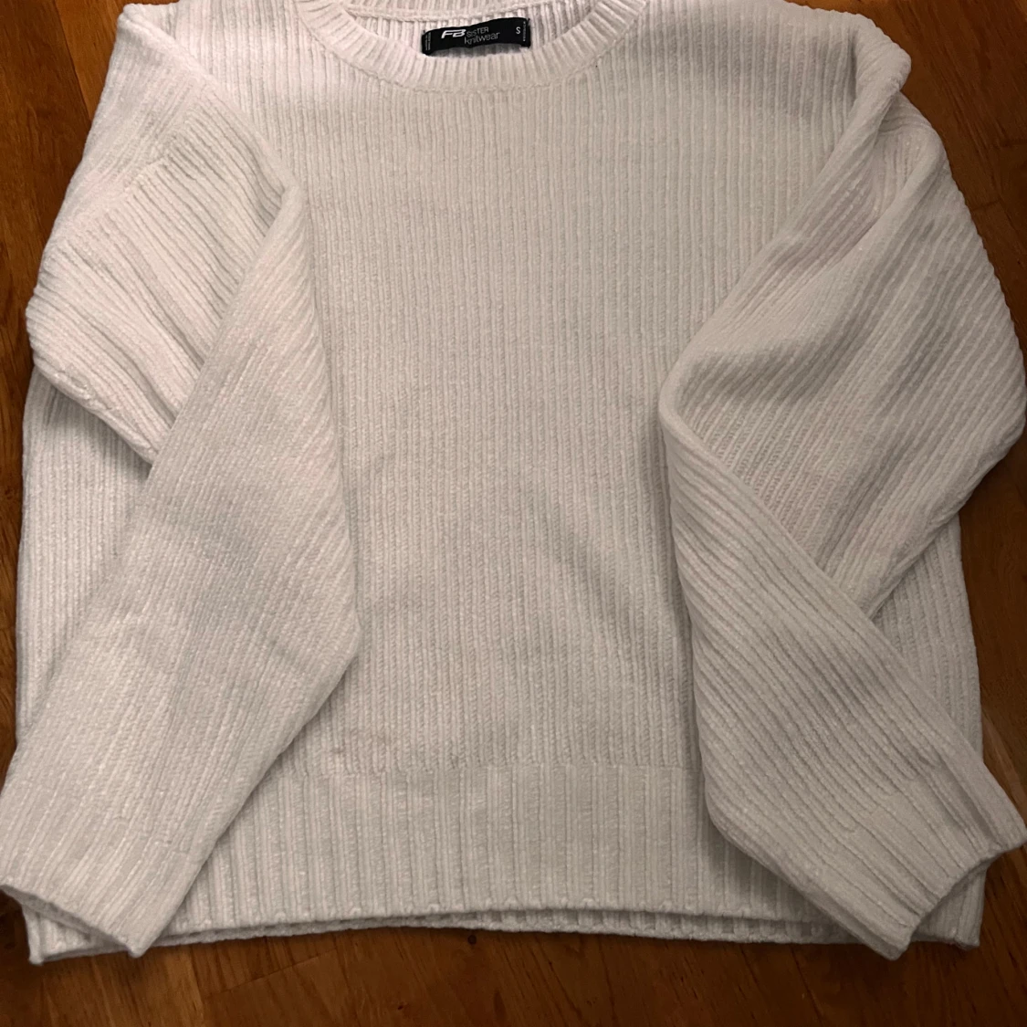 Säljer en vit stickad tröja med ribbad struktur och rund halsringning. Tröjan har långa ärmar och en klassisk, enkel design som passar perfekt till många olika outfits.
