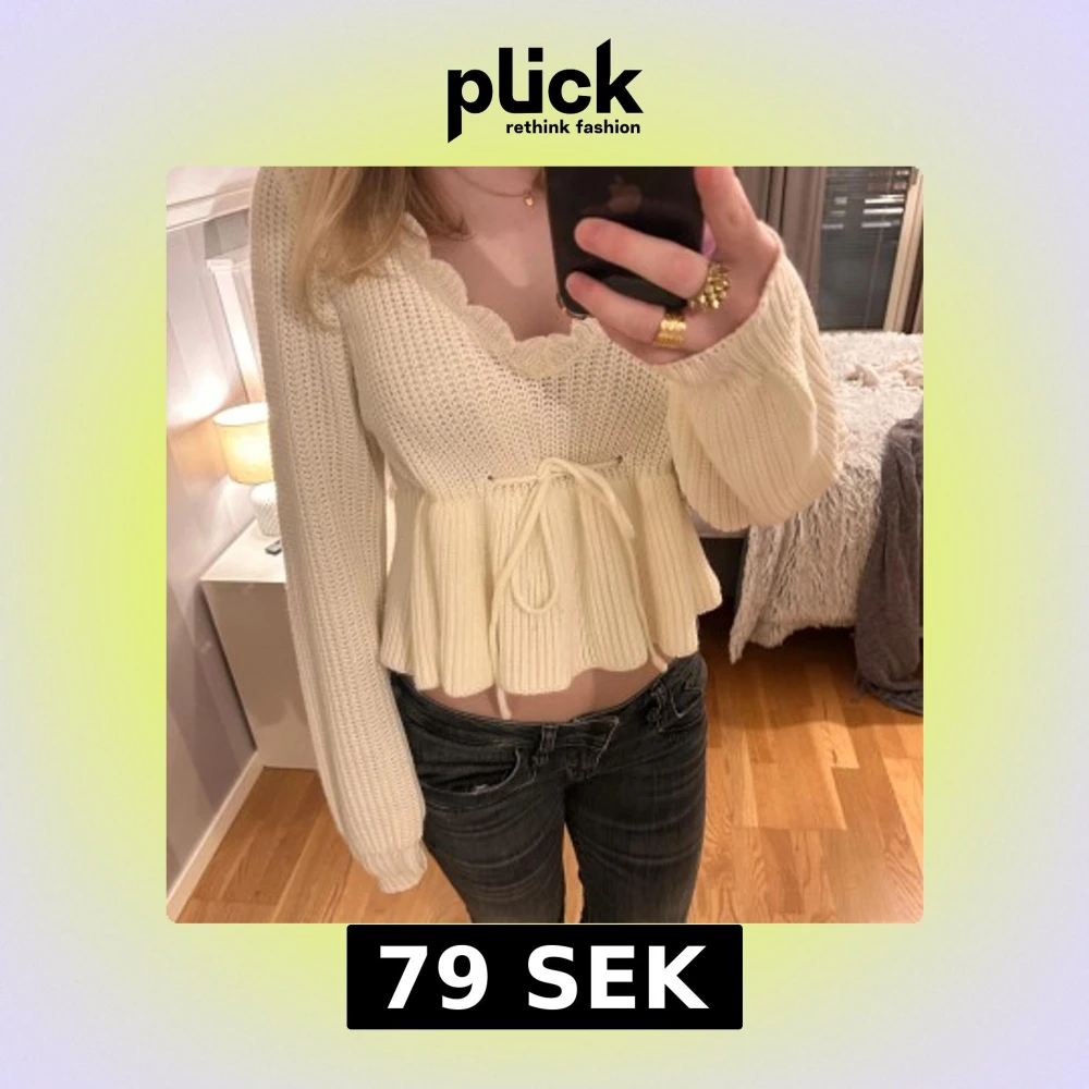 Säljer en söt vit ribbad stickad tröja med volangdetaljer och knytband i midjan. Tröjan har långa ärmar och en v-ringad halslinje. Osäker på storlek då lappen är borta. Passar s, xs, M