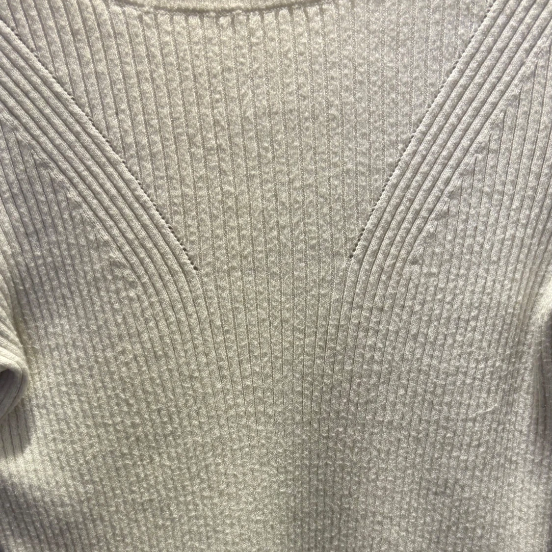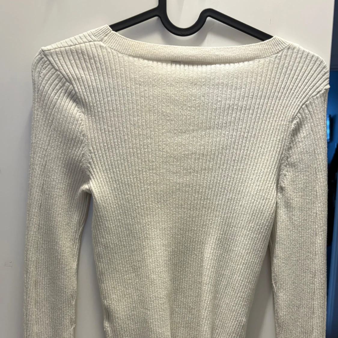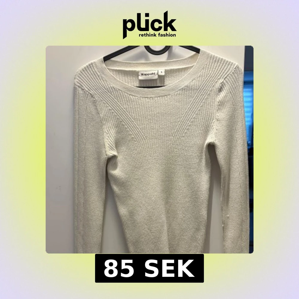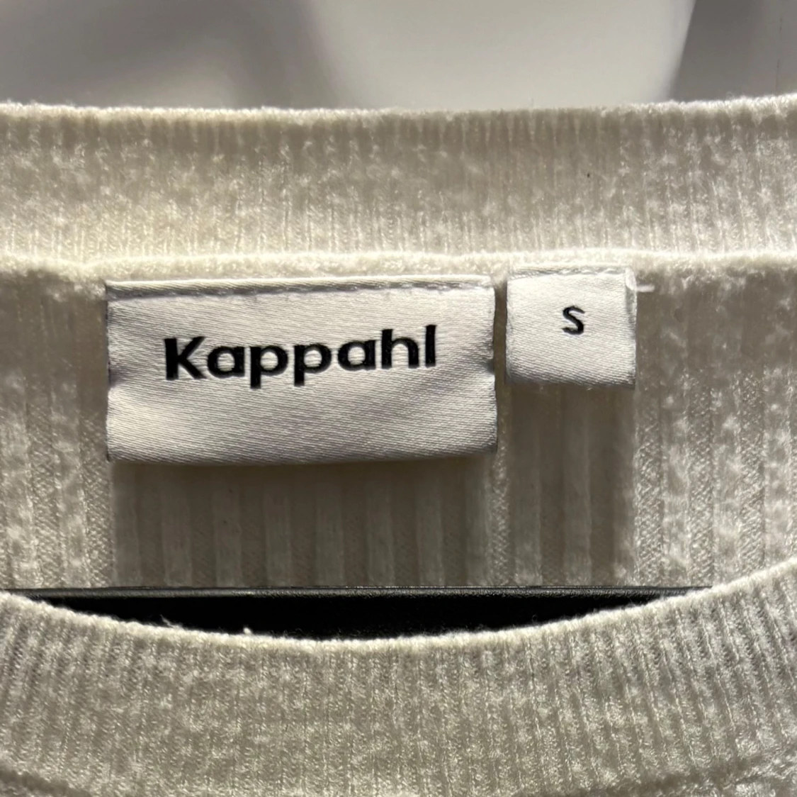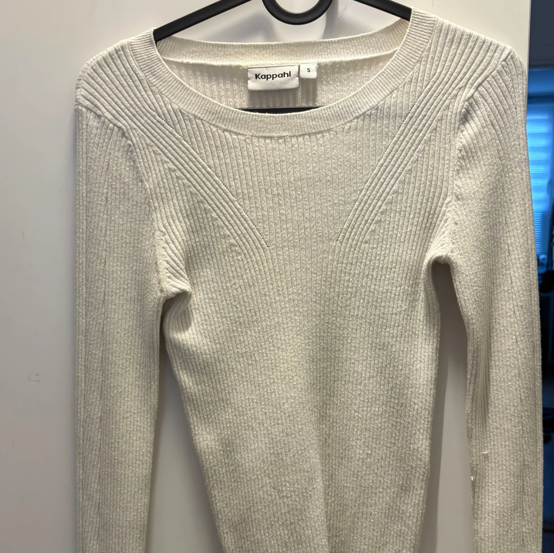 Vit stickad tröja från Kappahl i storlek S. Tröjan har ett ribbat mönster med snygga detaljer över axlar och bröst, rund halsringning och långa ärmar. Perfekt för lager-på-lager och enkel att matcha med jeans eller kjol.