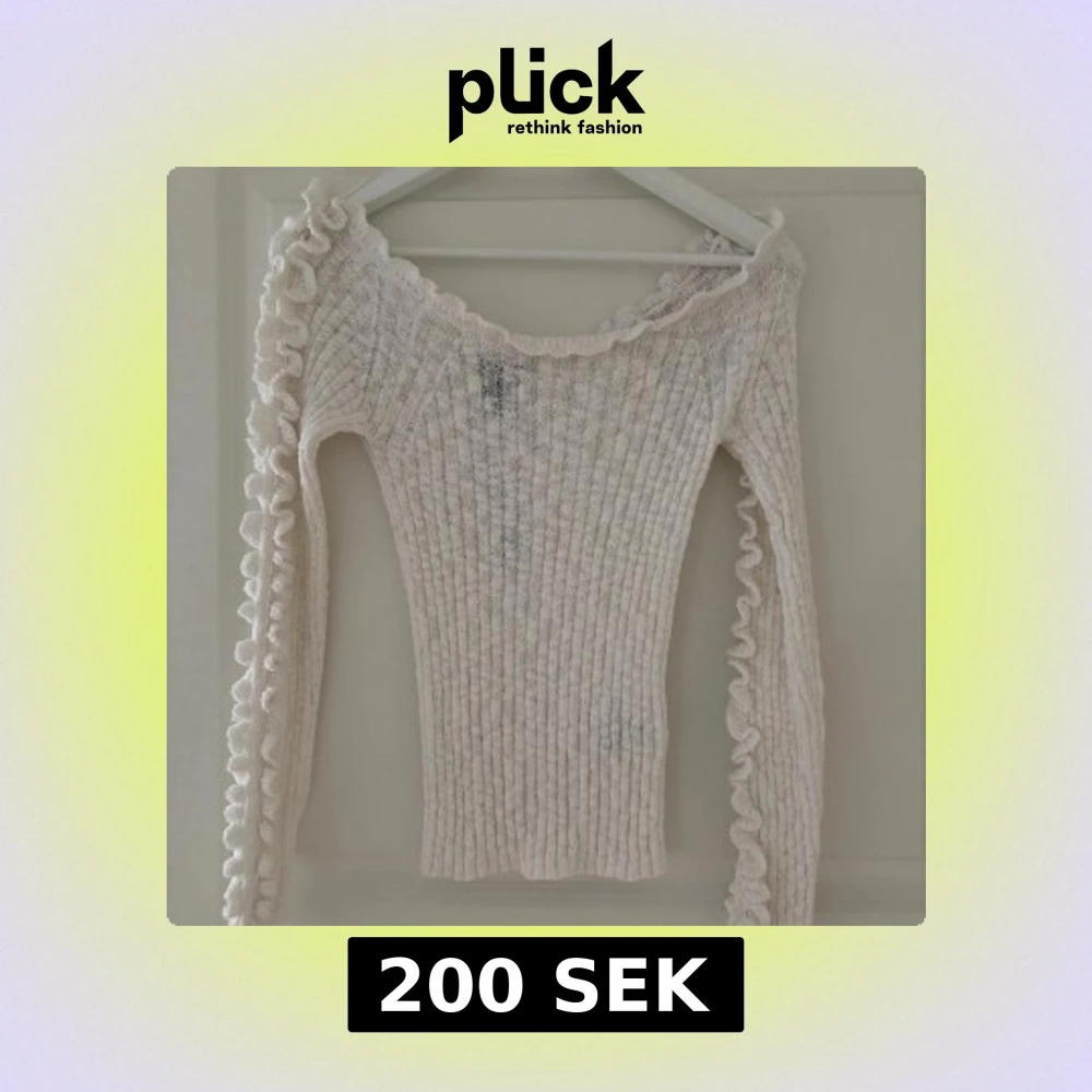 Supersöt vit ribbad stickad tröja från Lindex. Tröjan har långärmade ärmar med volangdetaljer längs axlar och ärmar samt en bred, något båtringad hals. Aldrig använd.