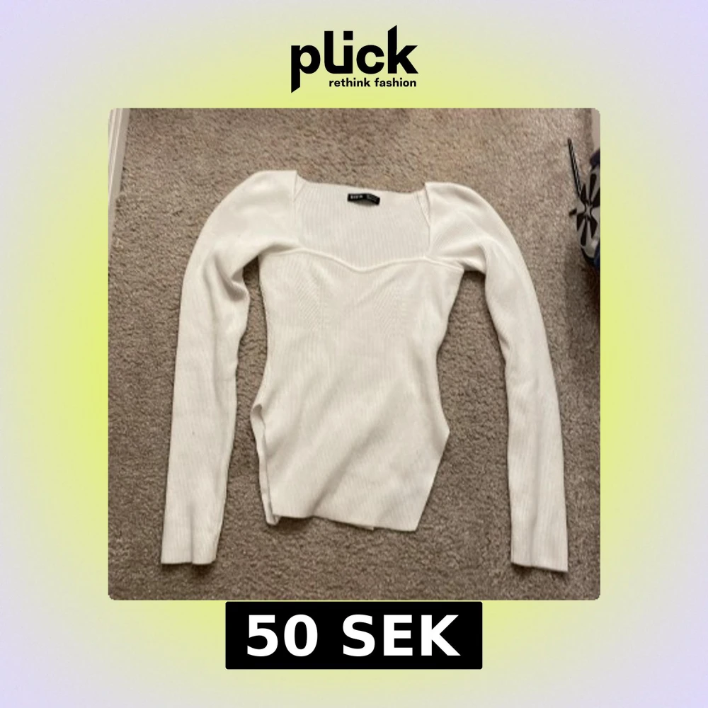 Säljer en stilren vit ribbad topp från Shein med långärmad design och fyrkantig halsringning. Perfekt för en chic och enkel look. Passar bra till både jeans och kjol.