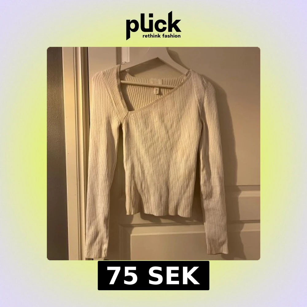 Säljer en stilren vit ribbad tröja från H&M med en unik asymmetrisk halsringning. Tröjan har långa ärmar och är perfekt för lager-på-lager under kyligare dagar. Passar bra till både jeans och kjol för en avslappnad look.