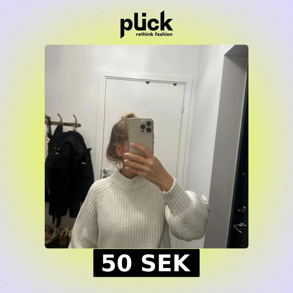 Supermysig vit ribbstickad polotröja med breda ärmar och hög krage. Tröjan har en loose fit och är perfekt för kyliga dagar. Materialet känns mjukt och värmande, och den ribbade strukturen ger en snygg och trendig look.