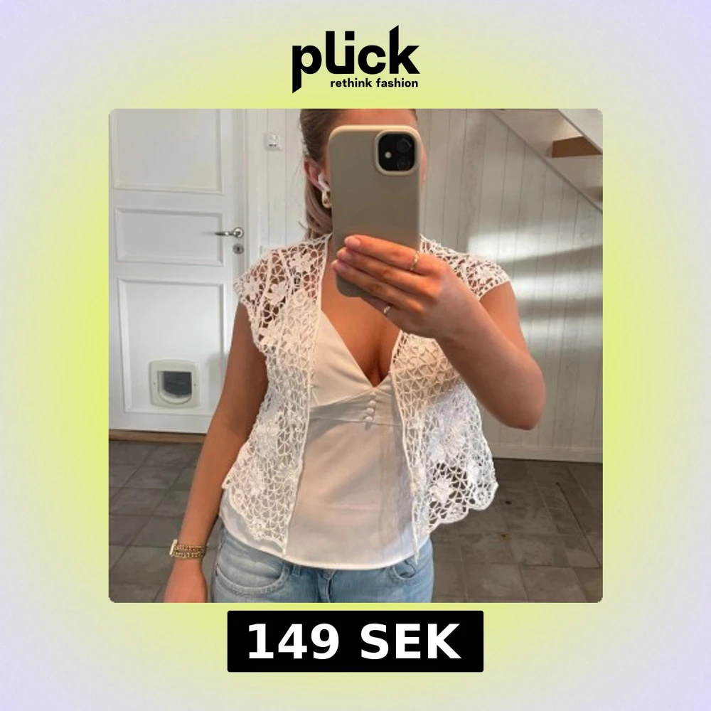 Säljer en söt vit spetsbolero med korta ärmar som passar till allt😍Storlek 38💞