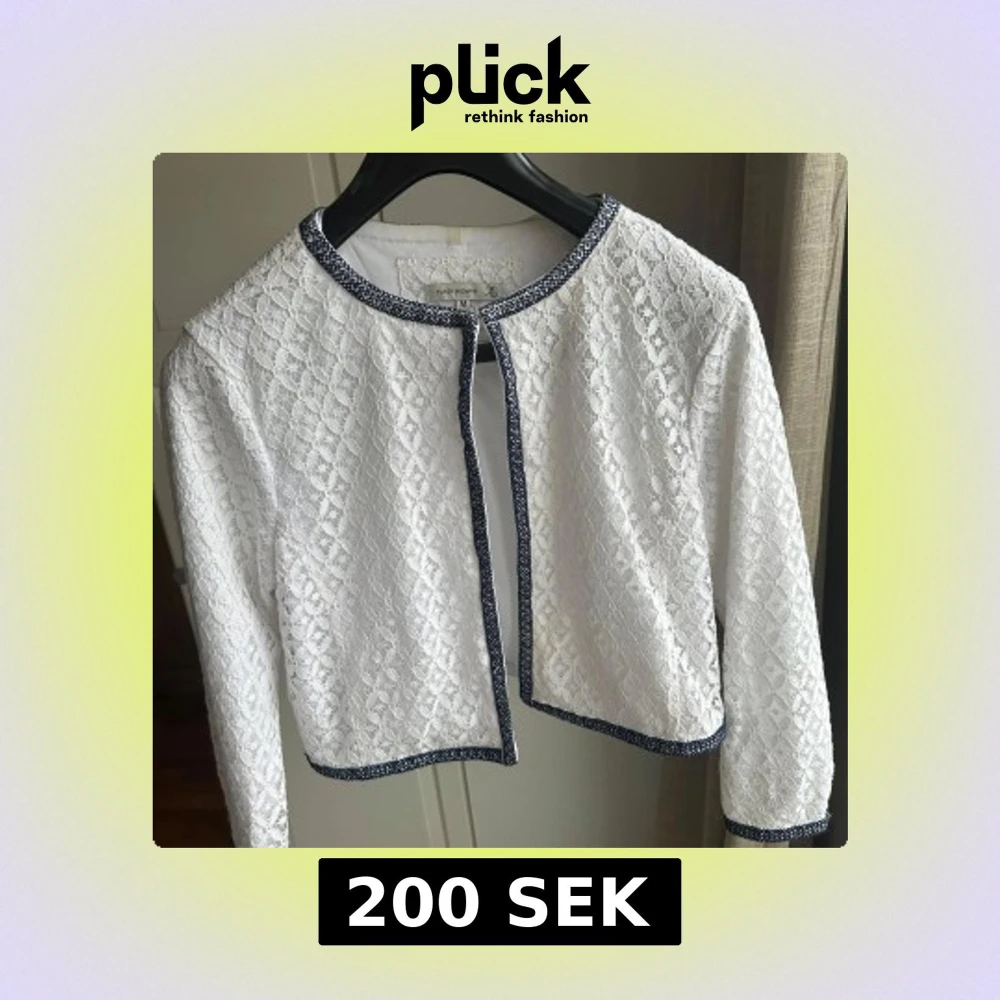 Säljer en elegant vit spetskofta med en fin spetsdesign med mörkblå kantdetaljer och den är långärmad. Perfekt till våren!