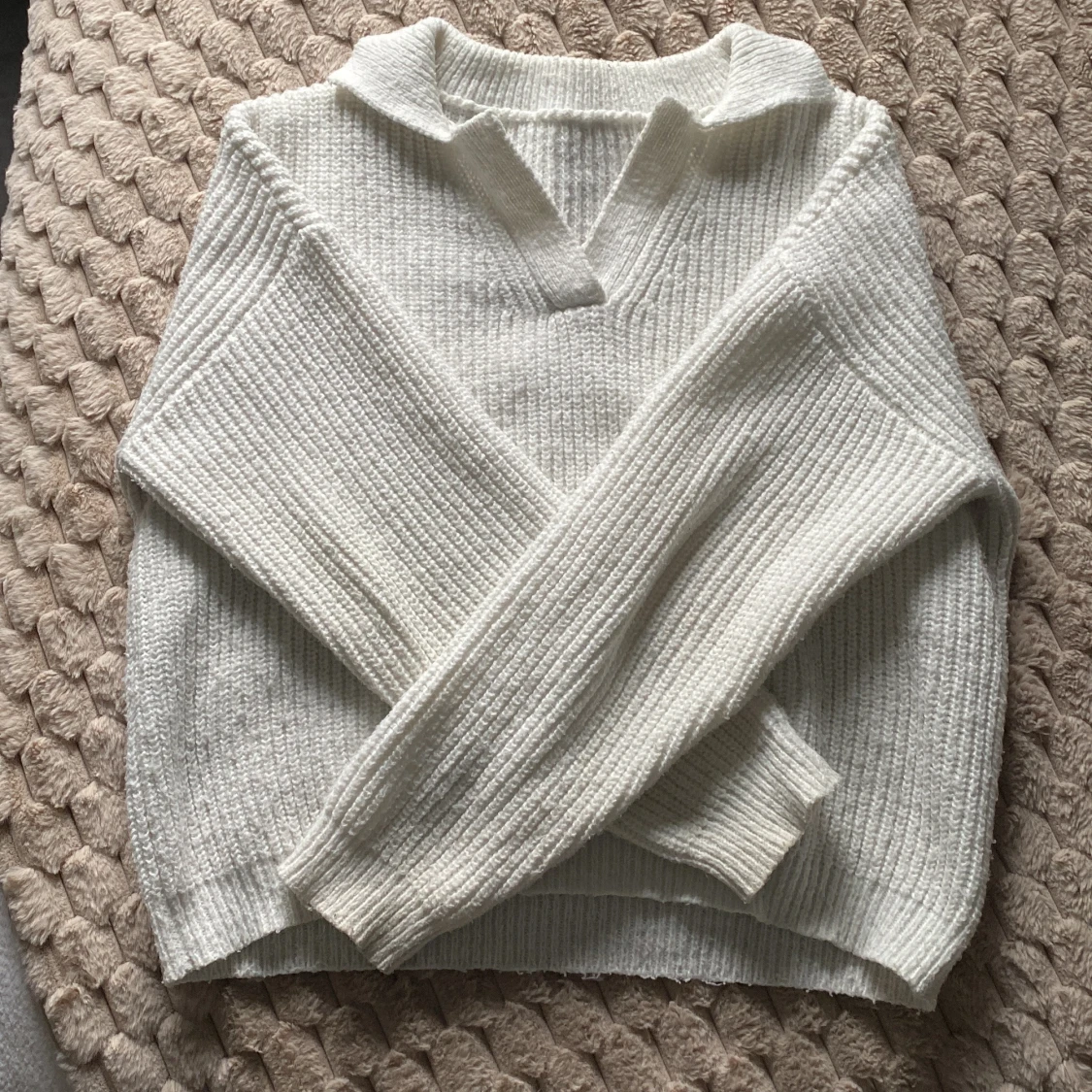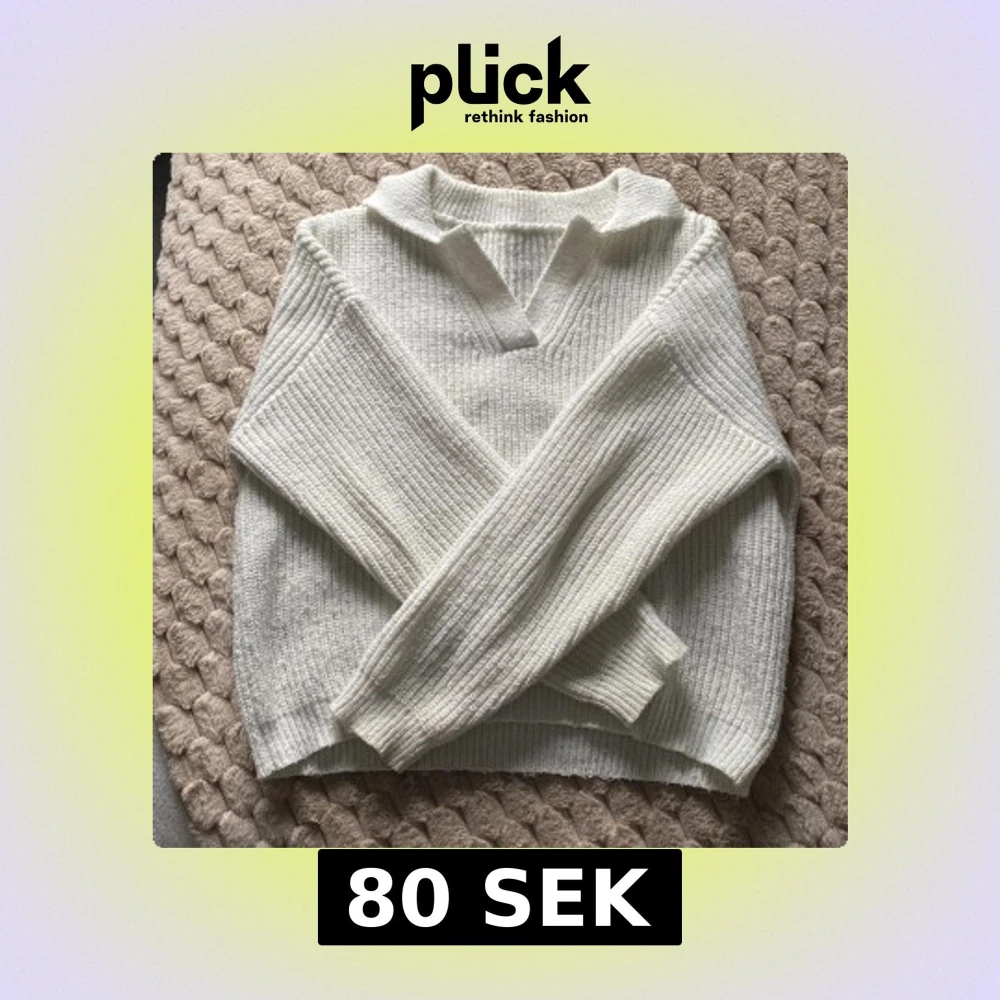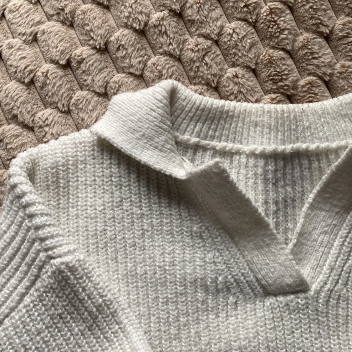 vit stickad tröja med krage och v-ringad.