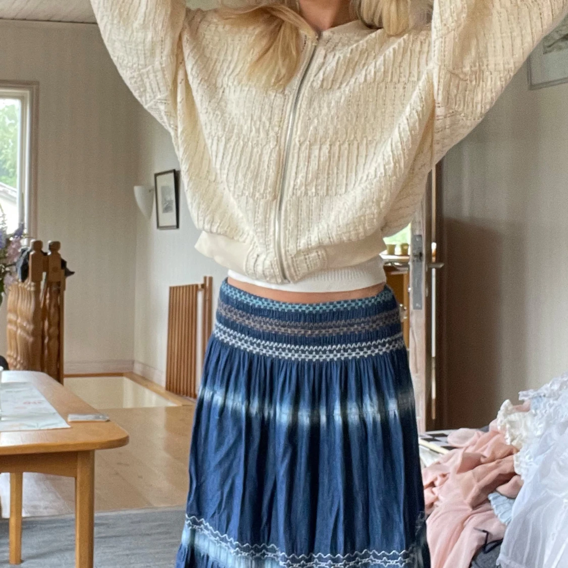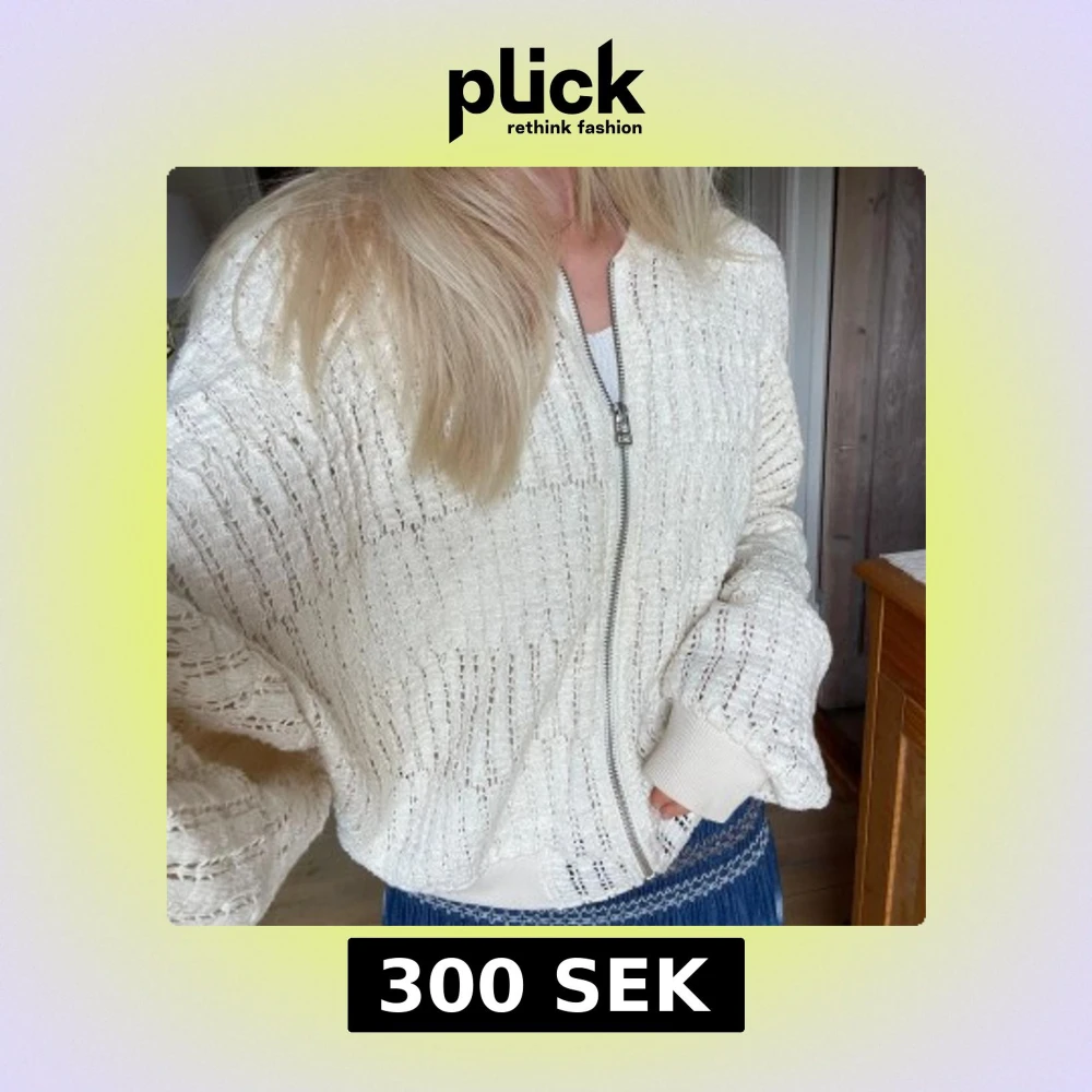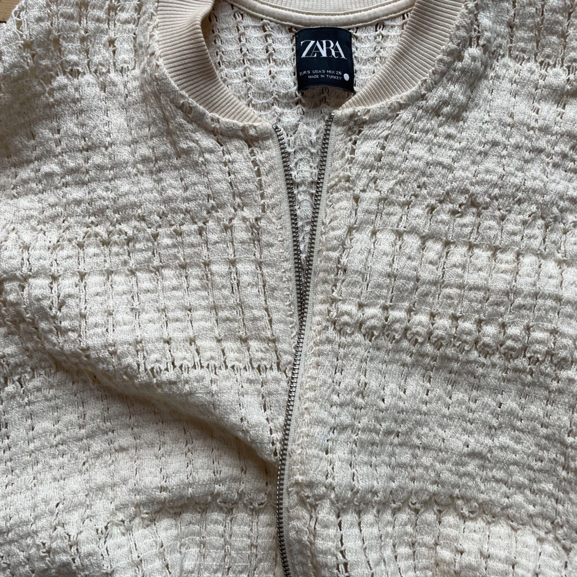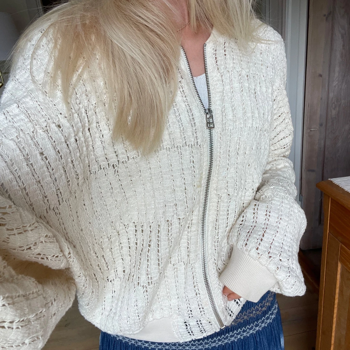 Säljer en vit/beige stickad bomberjacka från Zara med coolt hålmönster och dragkedja framtill. Nypris på 600kr, fortfarande i nyskick! Perfekt som både jacka och kofta😋😋 (säljer även kjolen💓💓)