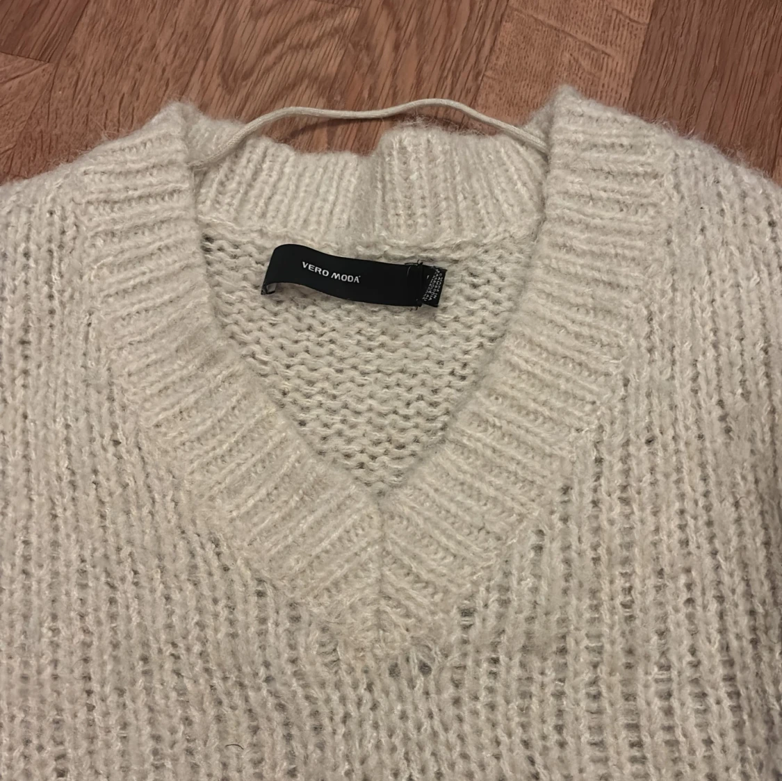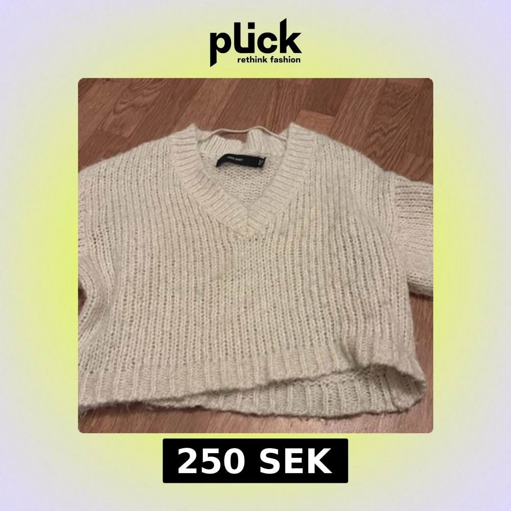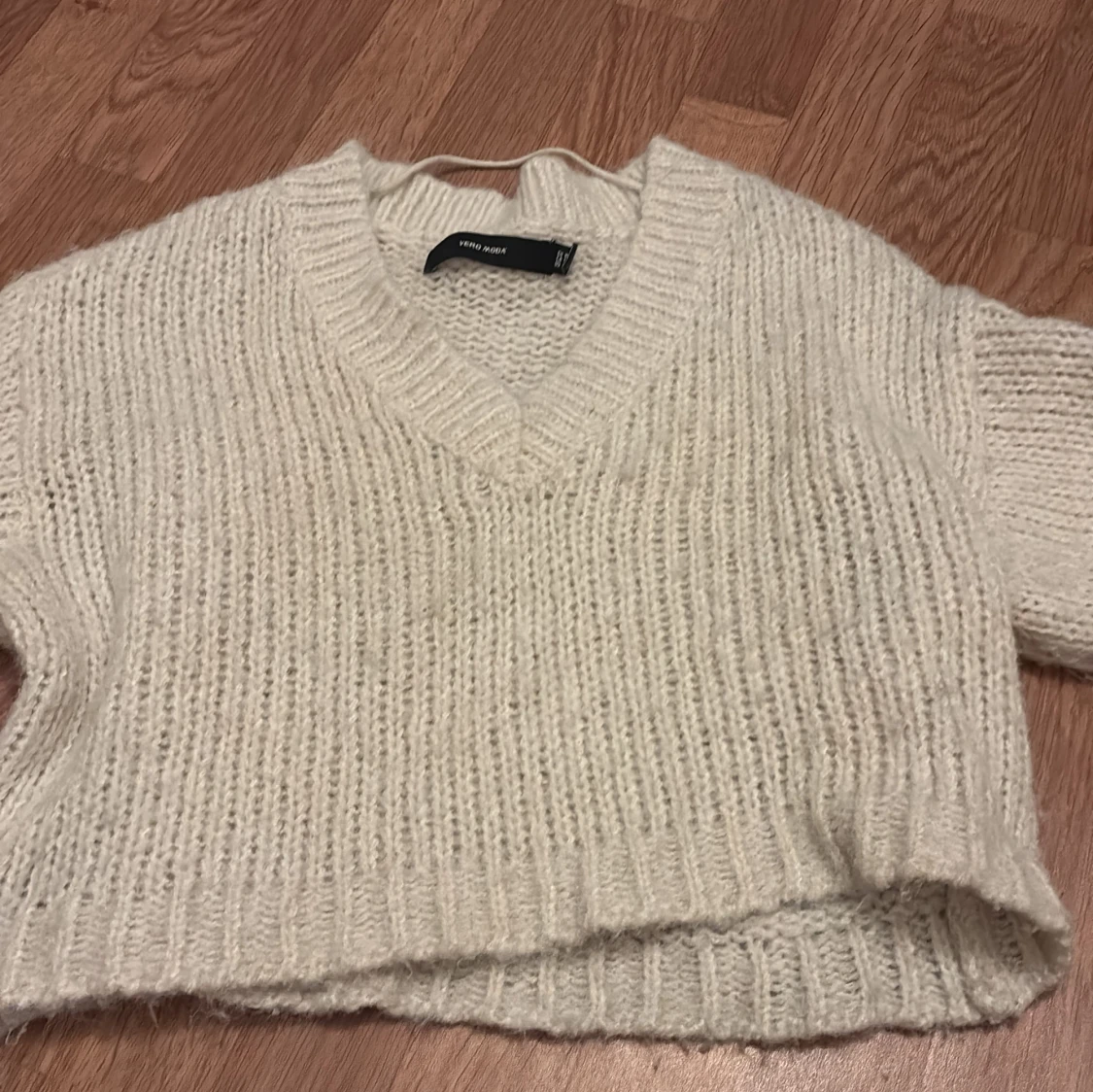 Mysig vit stickad tröja från Vero Moda med v-ringning och croppad passform. Tröjan har långa ärmar och ribbade muddar vid hals, ärmslut och nederkant. Perfekt för lager-på-lager-stil.