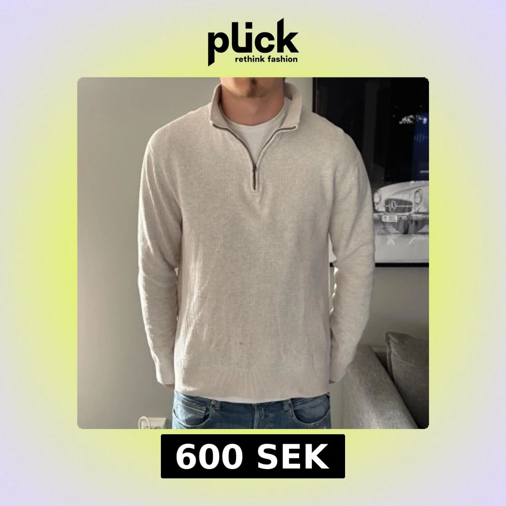 Snygg vit stickad tröja med half zip och hög krage. Tröjan har en diskret struktur i materialet och är långärmad med ribbade muddar vid ärmslut och nederkant. Perfekt för dig som gillar stilrena och enkla plagg med lite extra detalj.