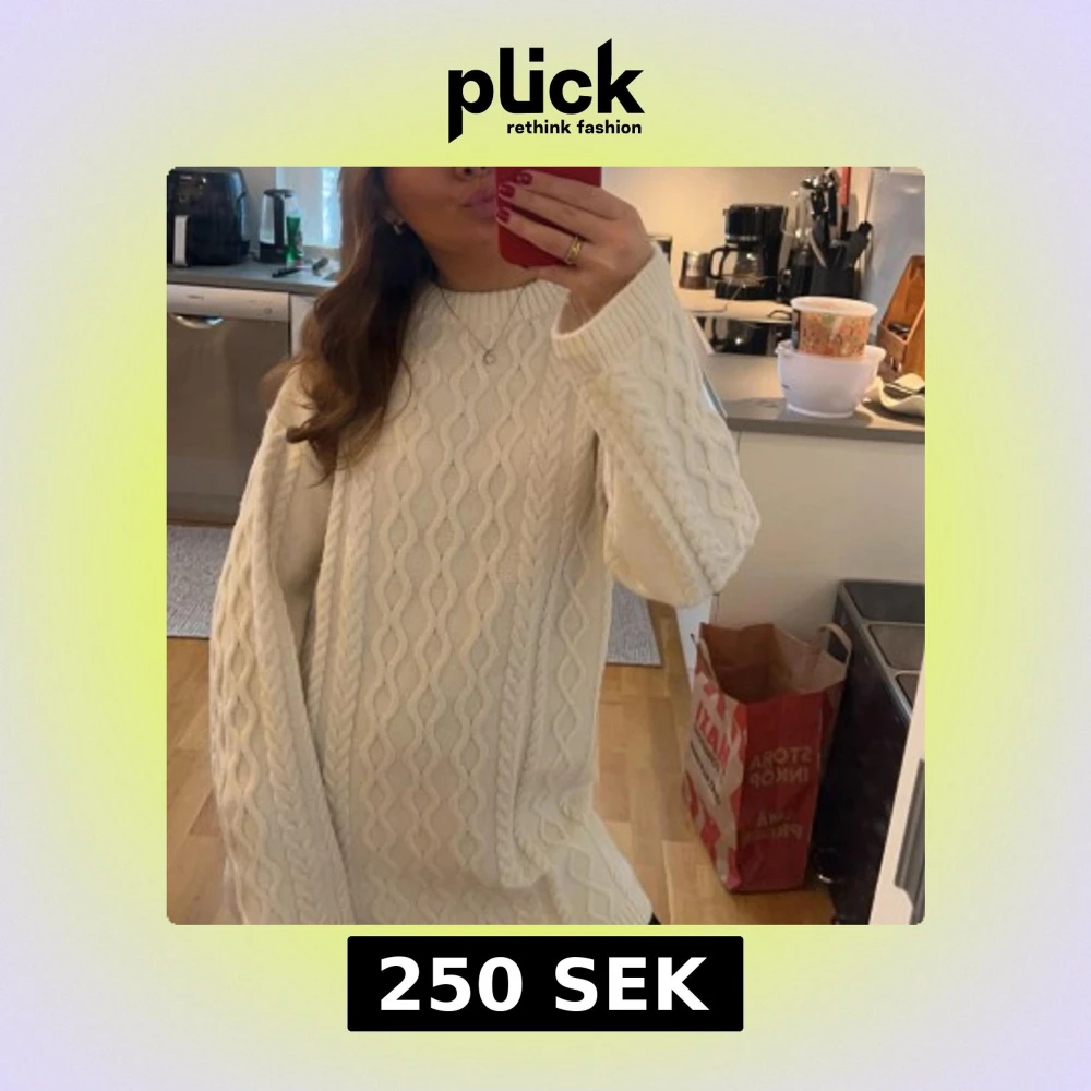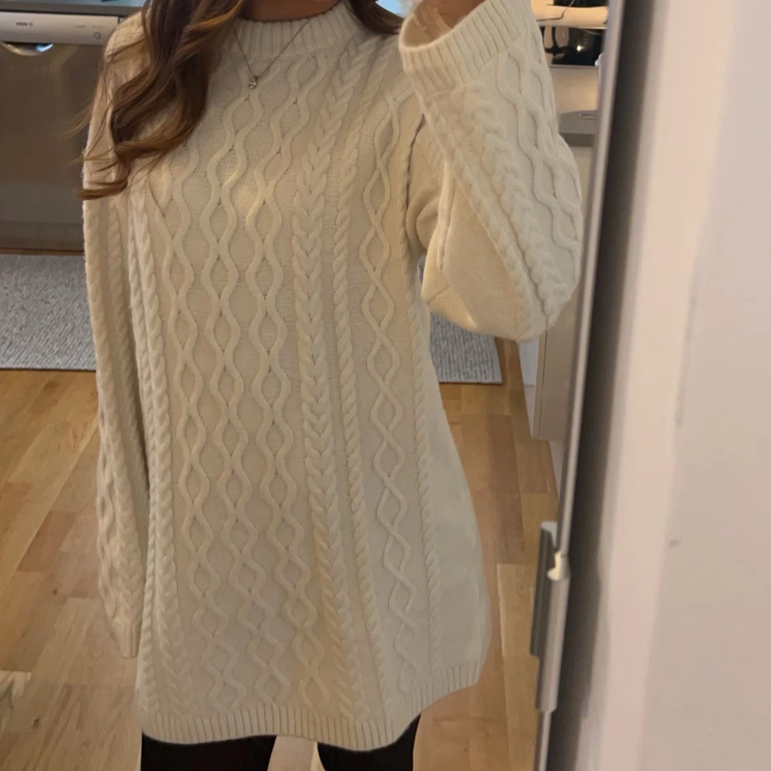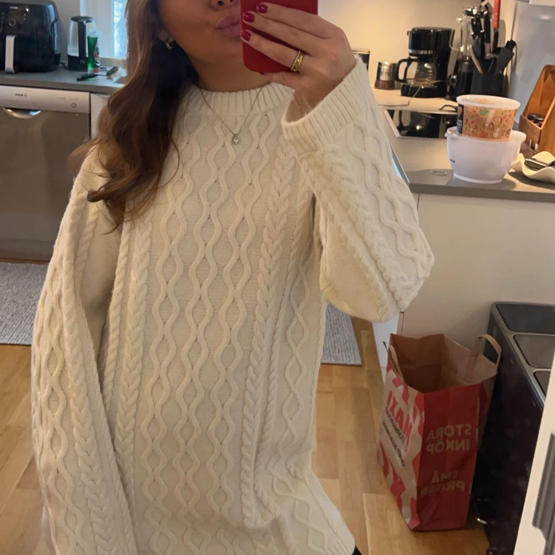 Super mysig vit stickad klänning med kabelstickat mönster. Klänningen har en avslappnad passform och är super skön. 💖💖