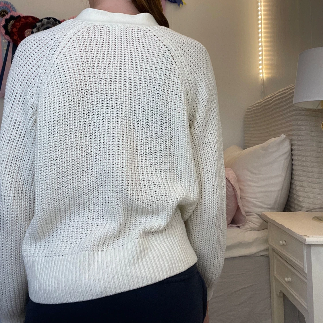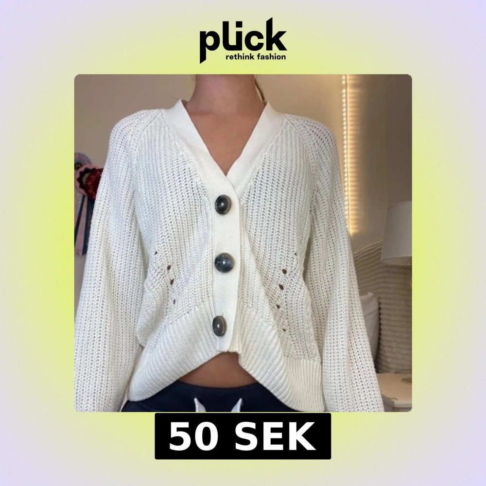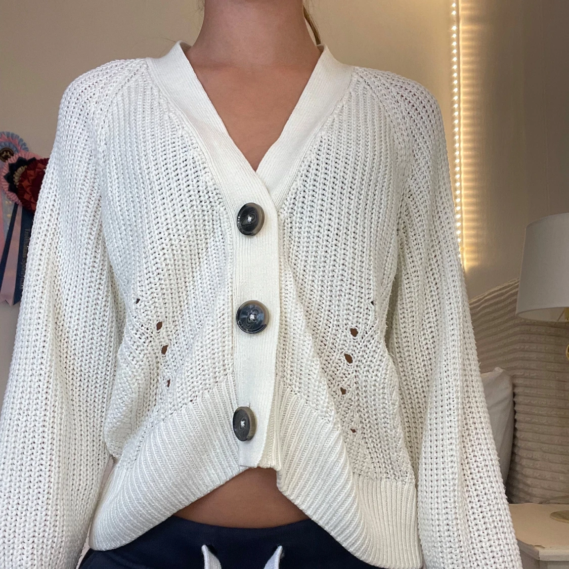 Säljer en vit stickad kofta med knappar från Lindex barn i strl 140, jag är Ca 155 och blir som en croppad modell på mig💗