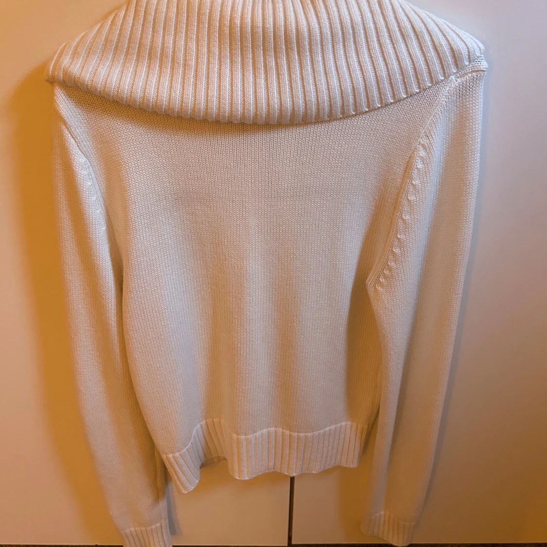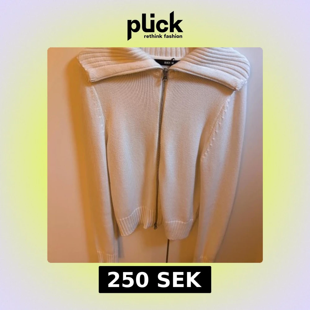 Säljer en vit stickad kofta från Bik Bok med bred ribbad krage och dragkedja framtill. Koftan har långärmad design och ribbade muddar vid ärmslut och nederkant. Perfekt för lager-på-lager under kyliga dagar.