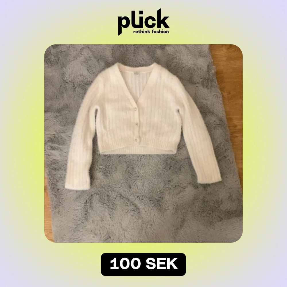 Säljer en superfin vit stickad kofta från Lindex i storlek 146/152. Den har en v-ringad design med knappar framtill och är croppad. Perfekt för höst och vinter, och den är både mysig och stilren.