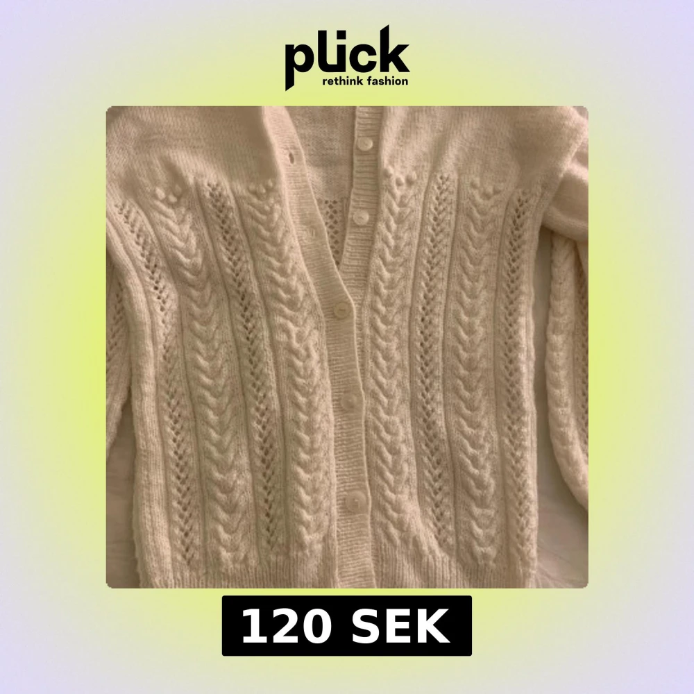Mysig vit stickad kofta med vackert flätmönster, Långärmad design med ribbade muddar. Egensydd så inget dess värre märke, använd några gånger men inget täcken på slitage. Creme beige i färgen, sitter som en s