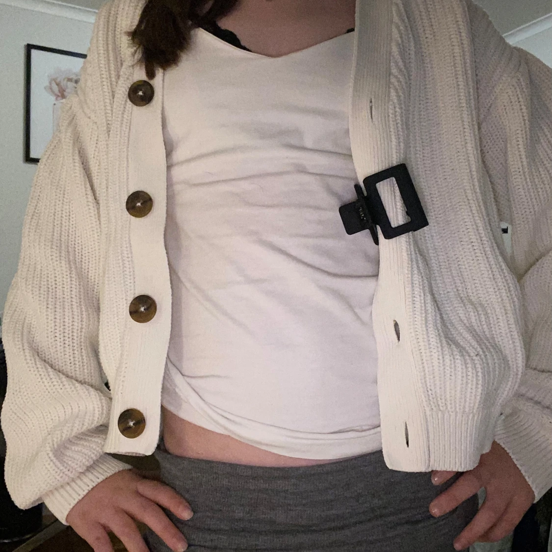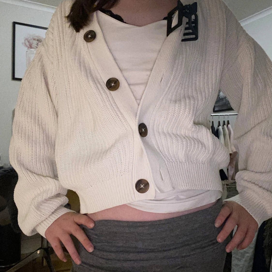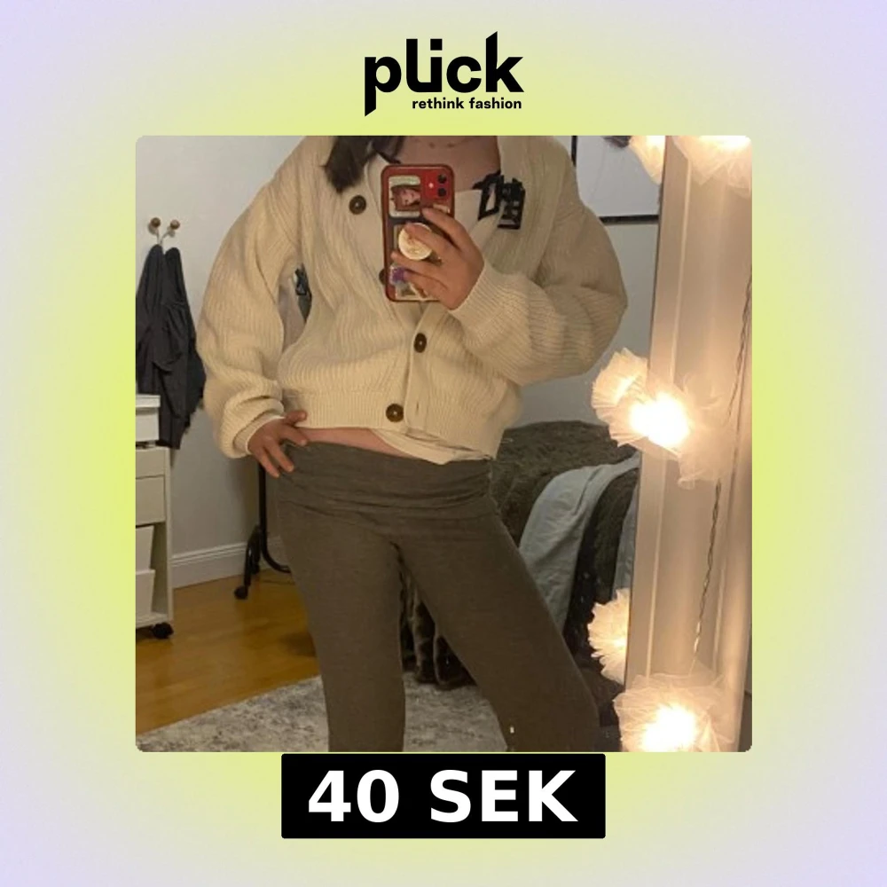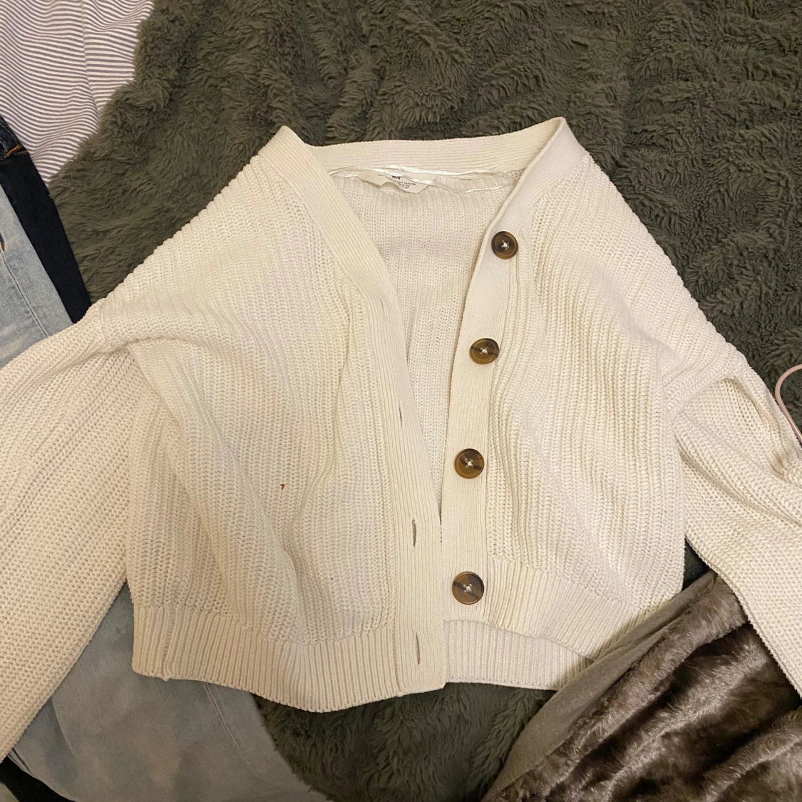 Säljer en beige stickad kofta från H&M med stora bruna knappar framtill. Koftan är croppad med loose passform och har långa ärmar samt ribbade muddar. Perfekt att slänga över en t-shirt för en chill look. Fråga om du vill ha fler bilder eller info!