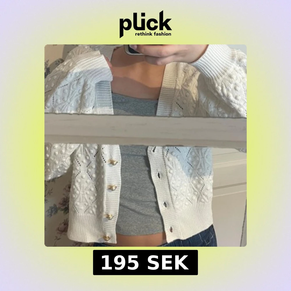 Säljer en söt vit stickad kofta med dekorativa knappar. Koftan har ett fint mönster och långa ärmar, perfekt för att hålla sig varm och stilren. Passar bra till både jeans och kjol. Perfekt för höst och vår!