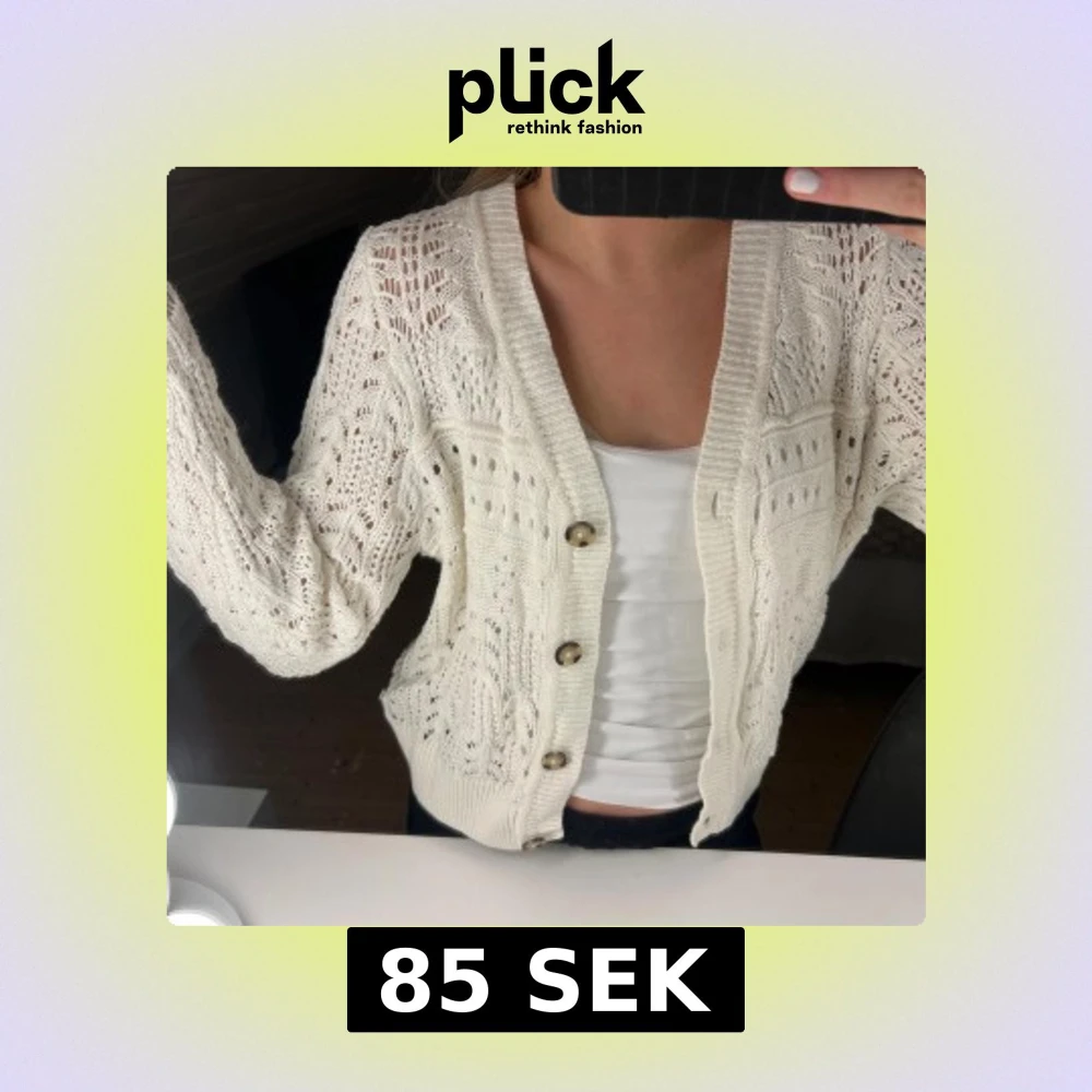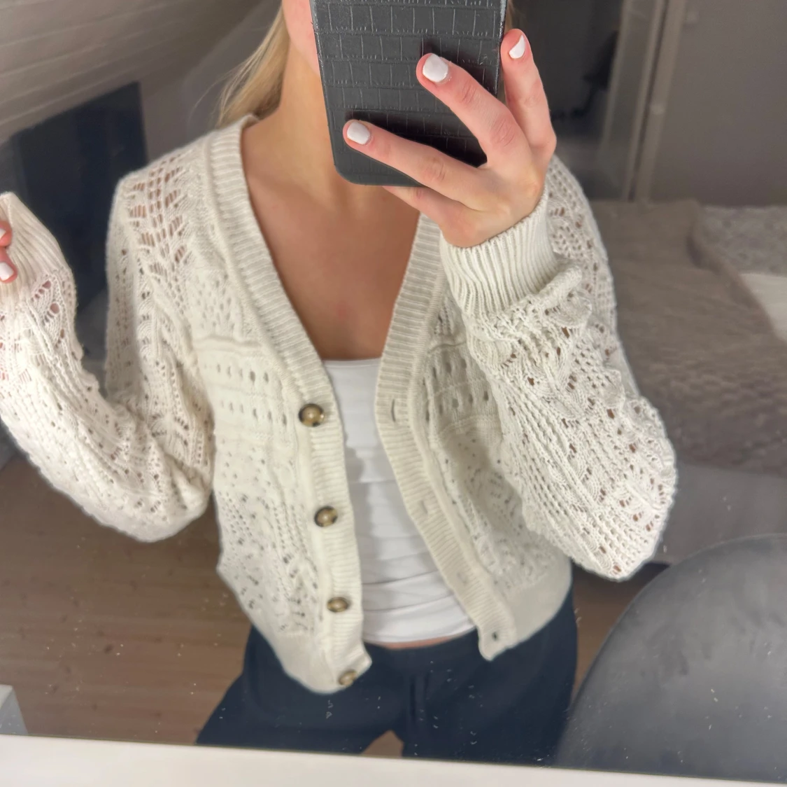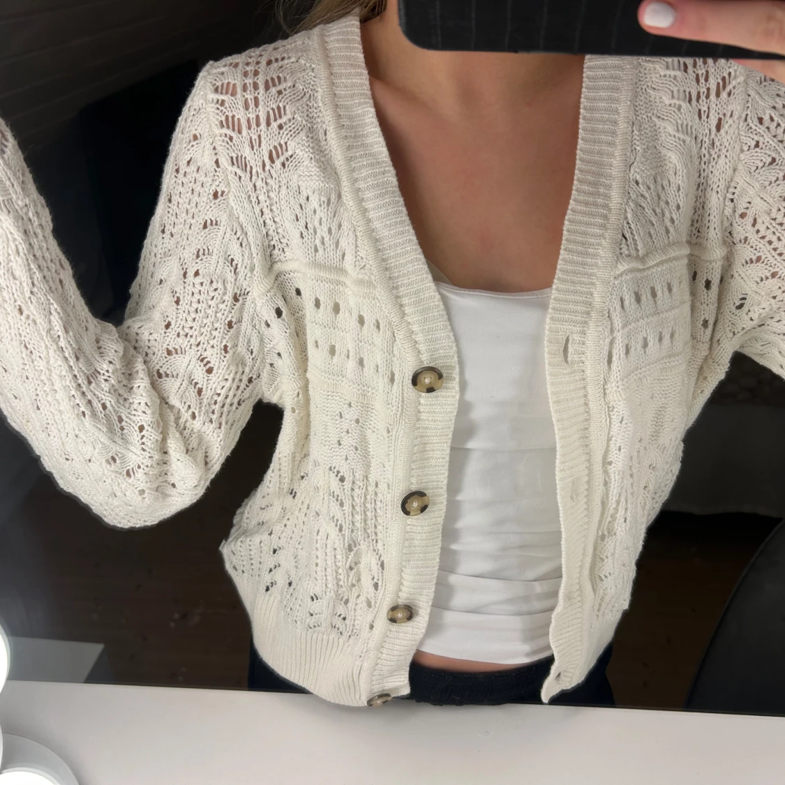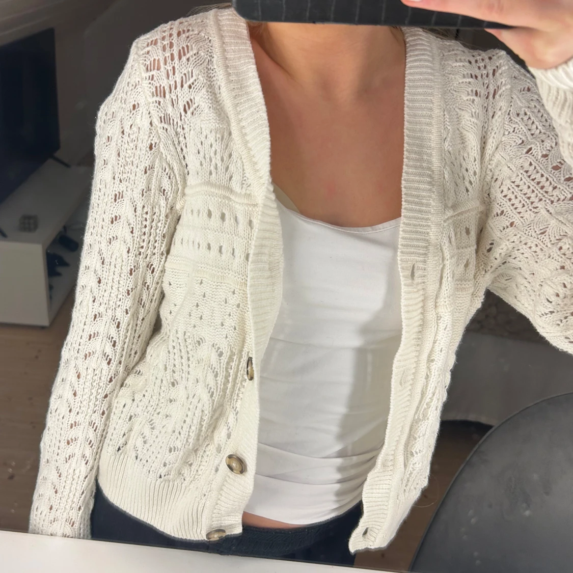 Säljer en söt vit stickad kofta med dekorativa knappar framtill. Koftan har ett fint hålmönster och långa ärmar, perfekt för lager-på-lager-stil. Passar bra till både jeans och kjol.