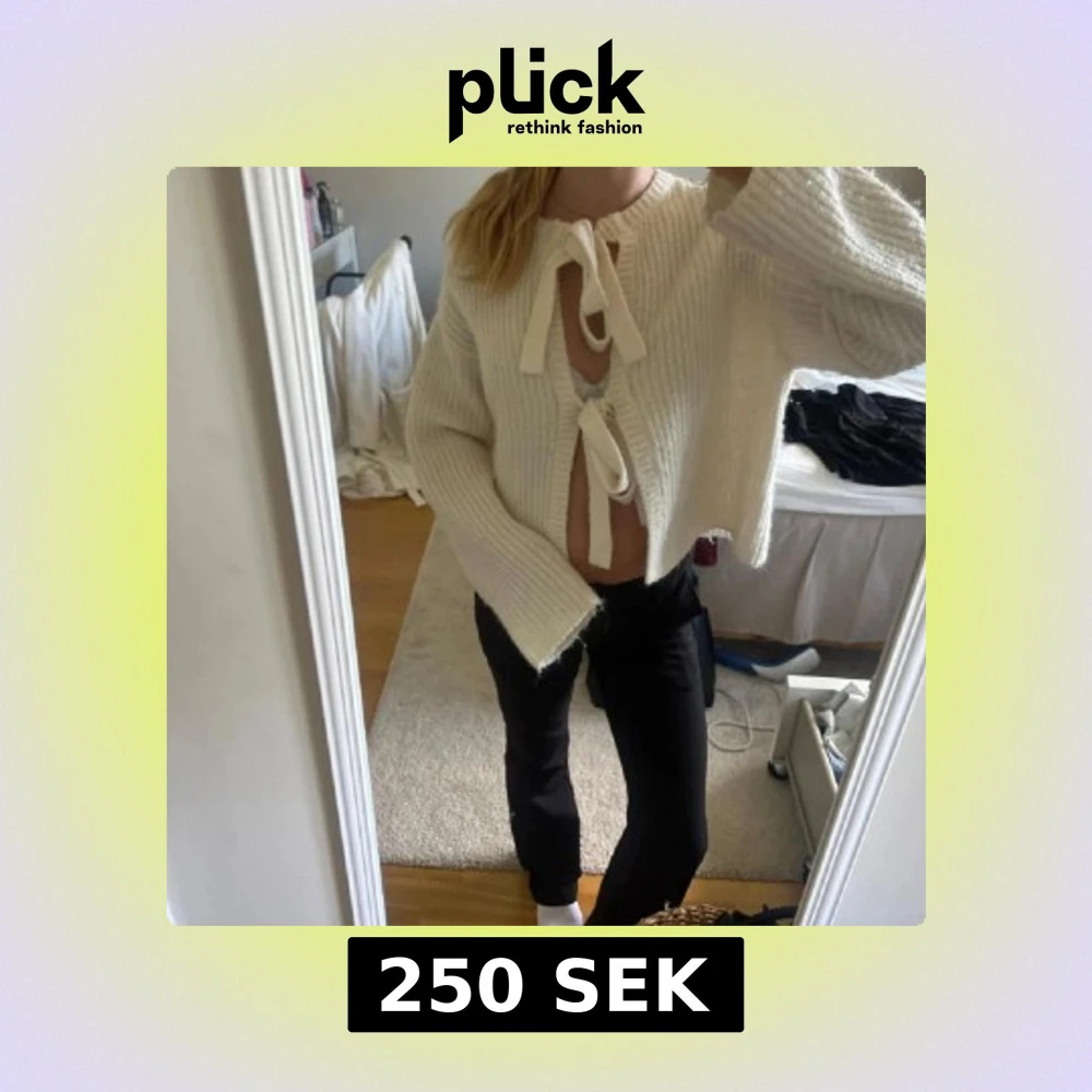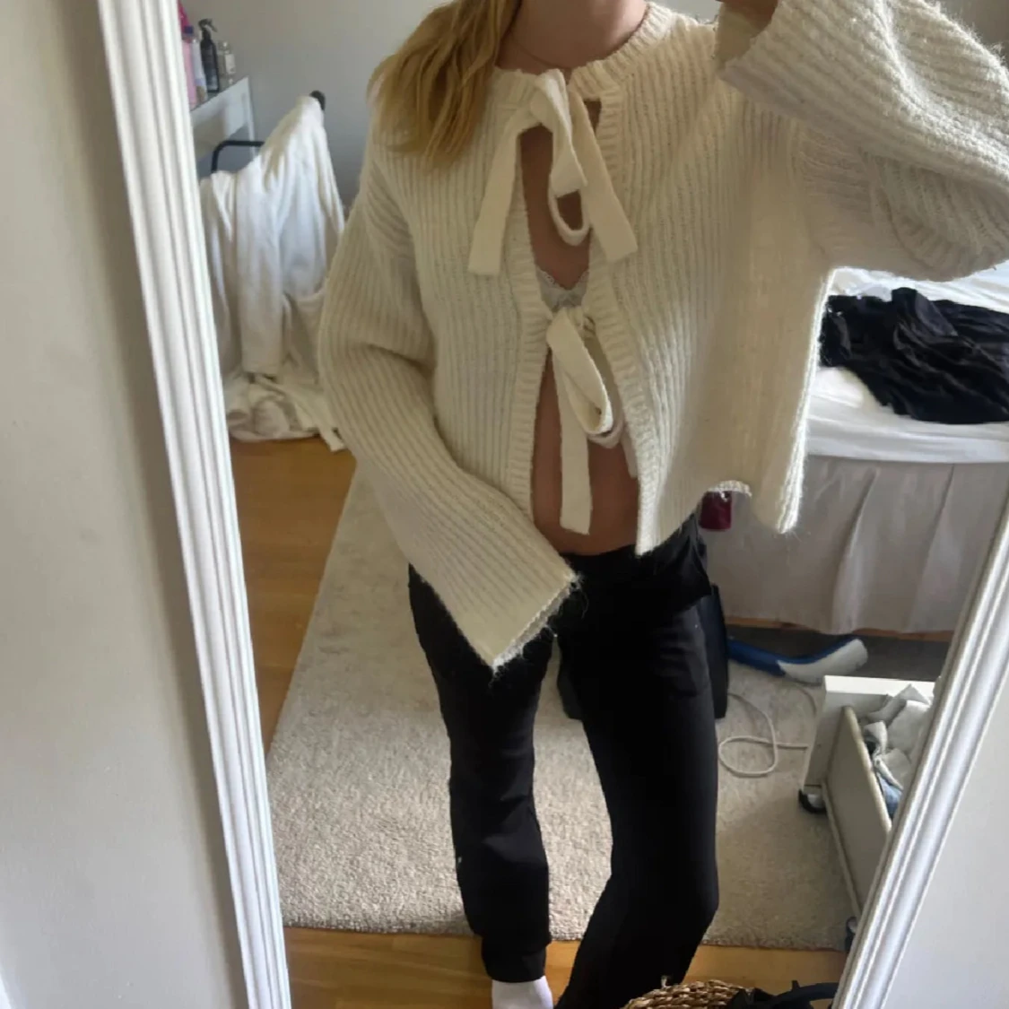 Superfin vit stickad kofta med två stora knytband framtill. Koftan är croppad med breda ärmar och ribbad struktur, perfekt för lager-på-lager och chill vibes.