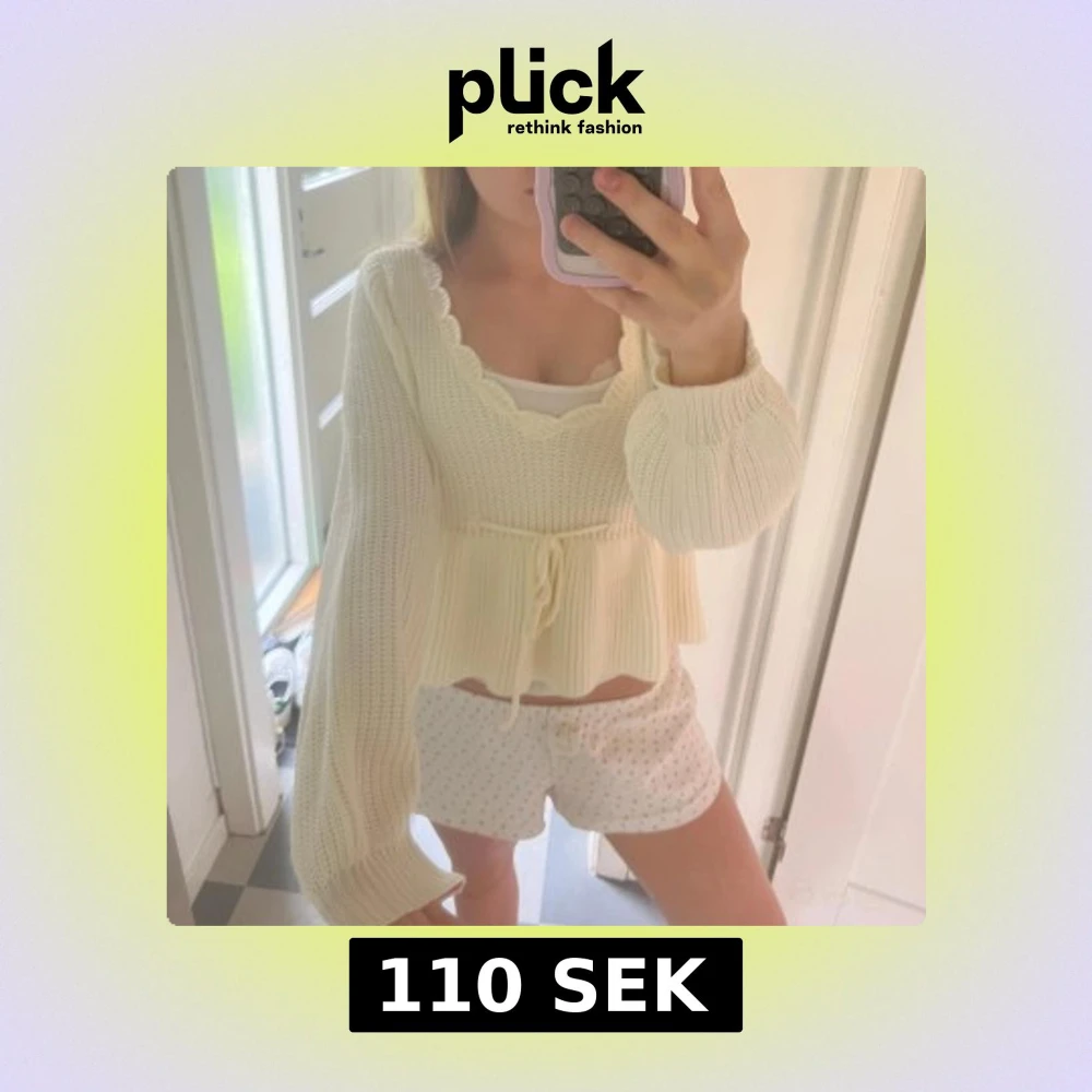 Säljer en söt vit stickad kofta med volangkant och knytband i midjan. Koftan har långa ärmar och en fin scallop-detalj vid halsringningen. Perfekt att slänga på sig över ett linne.