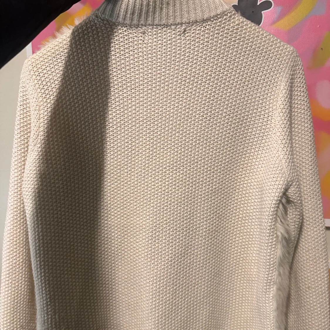 Säljer en stilren vit stickad kofta från Primark med mjuka pälsdetaljer på framsidan. Jackan har en hög krage och långa ärmar, perfekt för kyliga dagar. Den är både mysig och trendig, ett måste i garderoben!