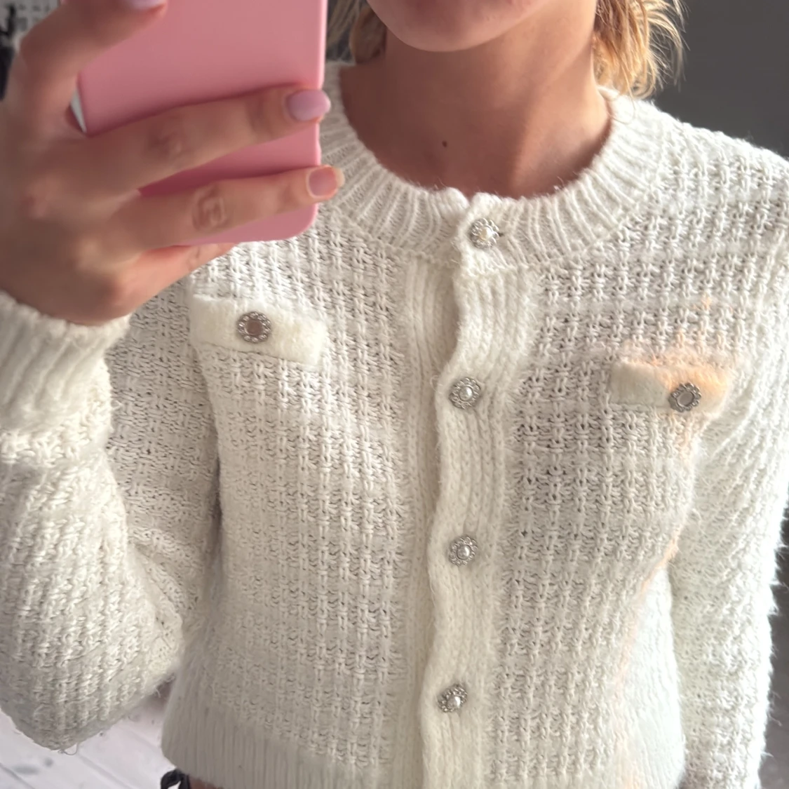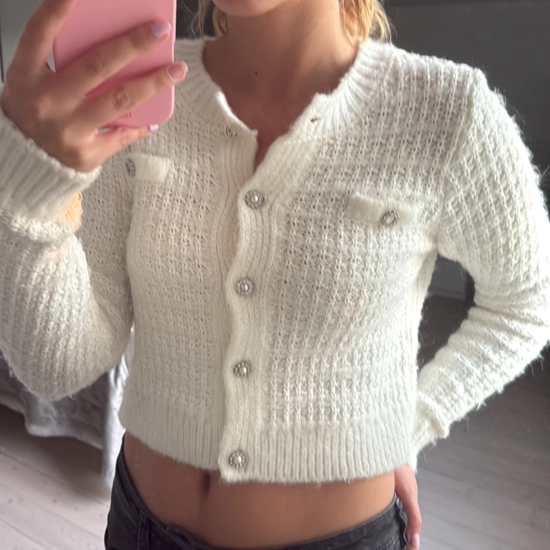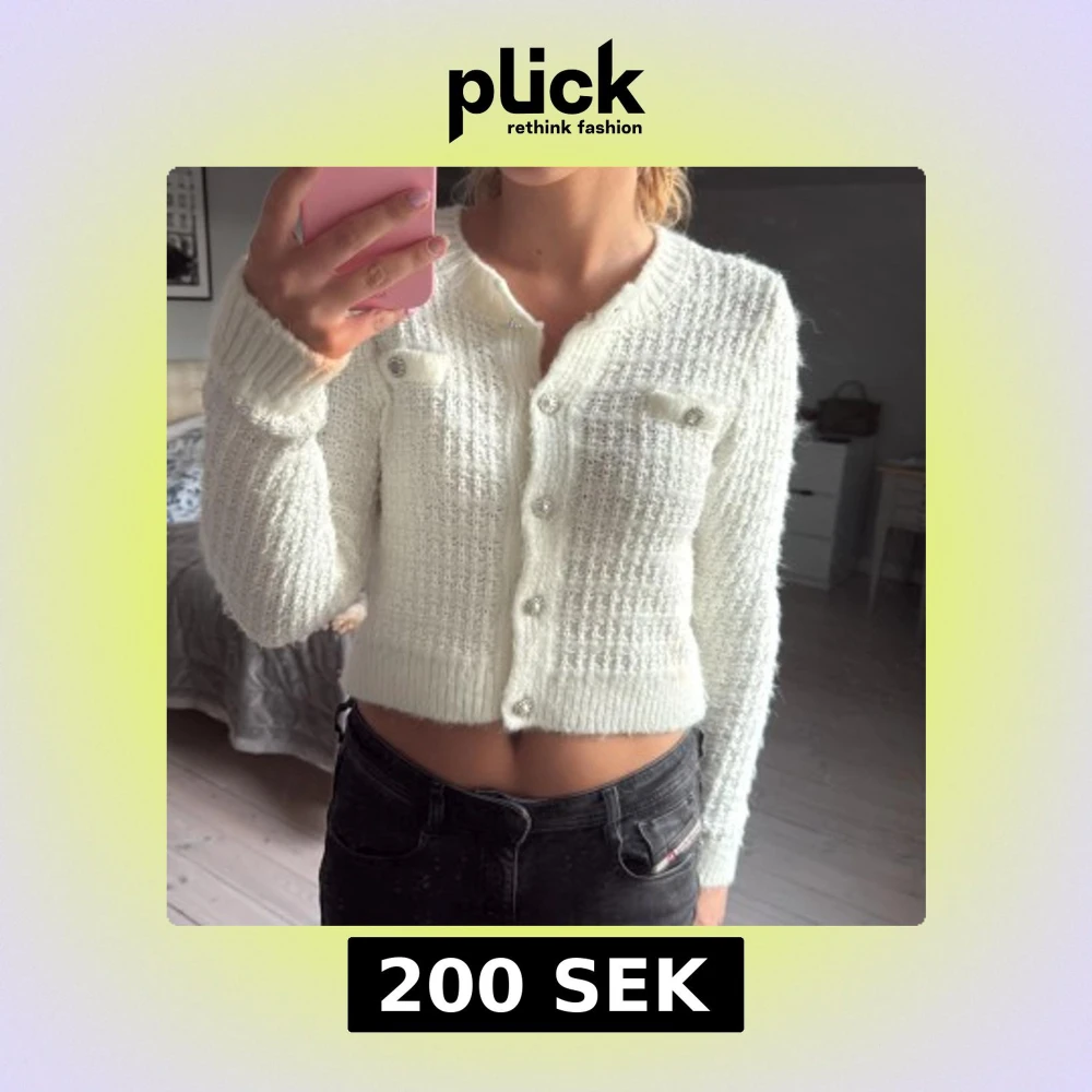 Superfin vit stickad kofta med glittriga pärlknappar och två dekorativa fickor framtill. Croppad modell med lång ärm och ribbade muddar.