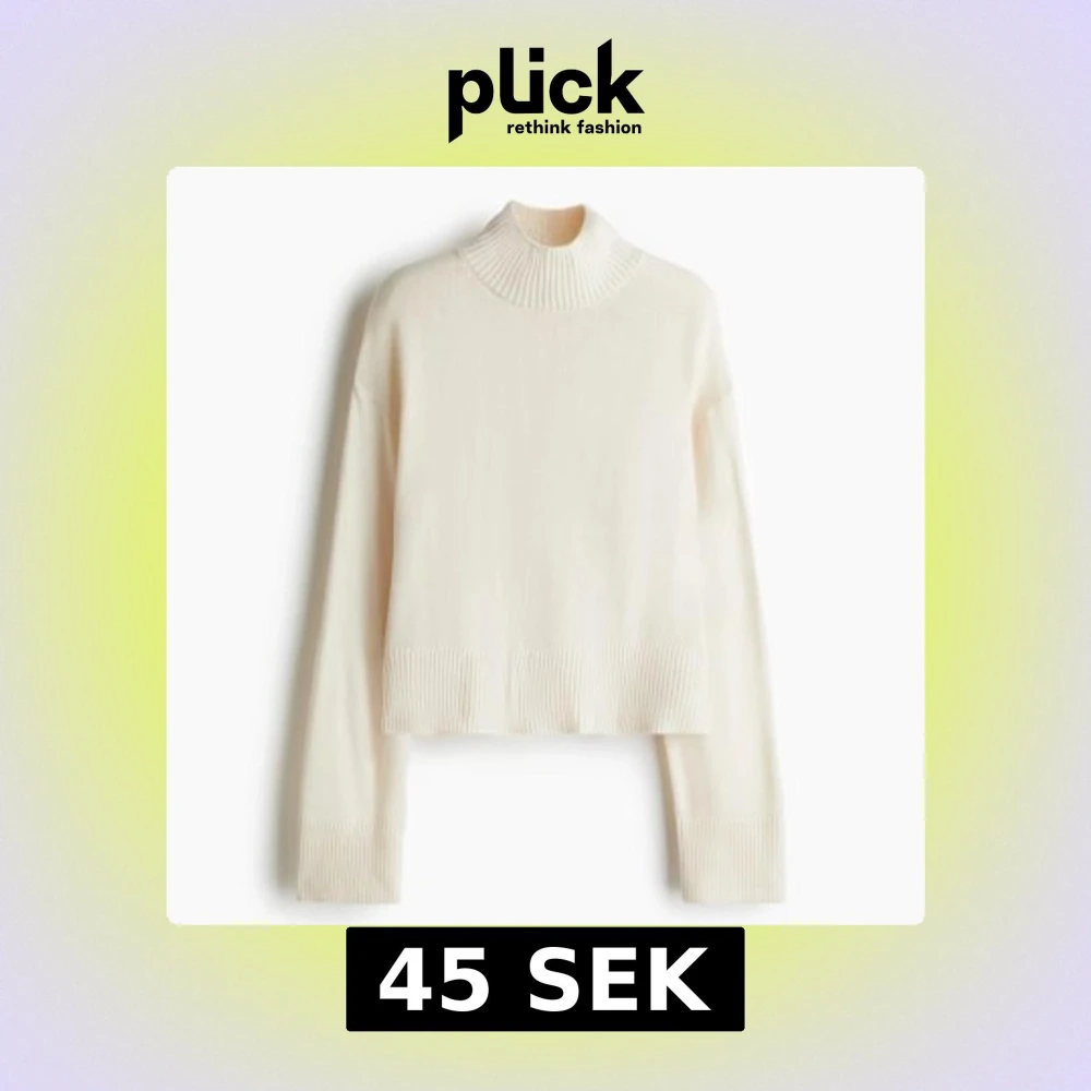 Säljer en stilren vit stickad polotröja med ribbade detaljer vid hals, ärmslut och nederkant. Tröjan har en hög krage och lång ärm, perfekt för lager-på-lager under kyliga dagar. Enkel att matcha med både jeans och kjol.