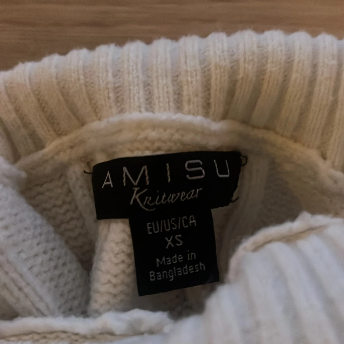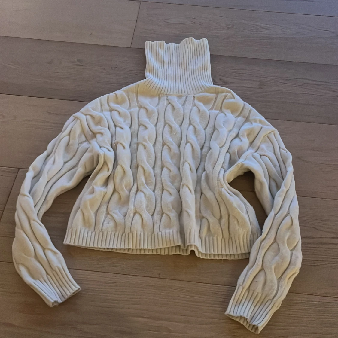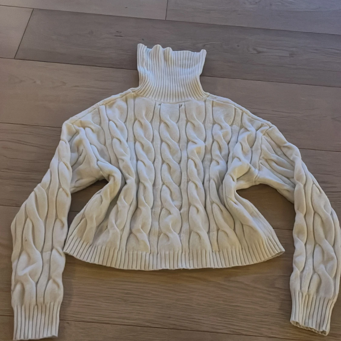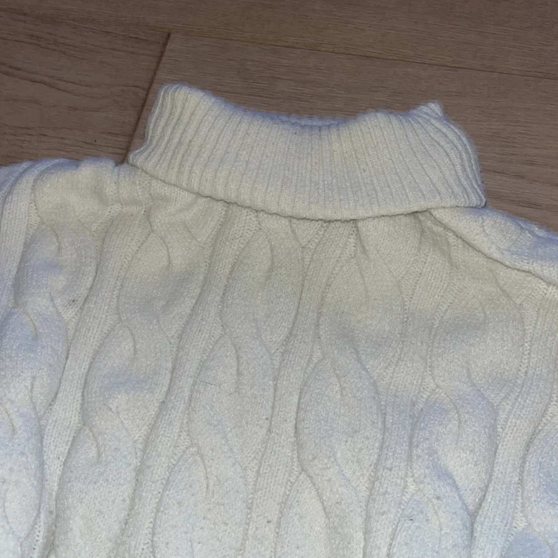 Säljer en superfin vit stickad polotröja från New yorker. Den är i storlek XS och är perfekt för höst och vinter. Tröjan har ett snyggt flätmönster och är croppad, vilket gör den både mysig och trendig. Den har långa ärmar och en hög polokrage som kan vikas ned och håller dig varm. Perfekt för både vardag och fest!