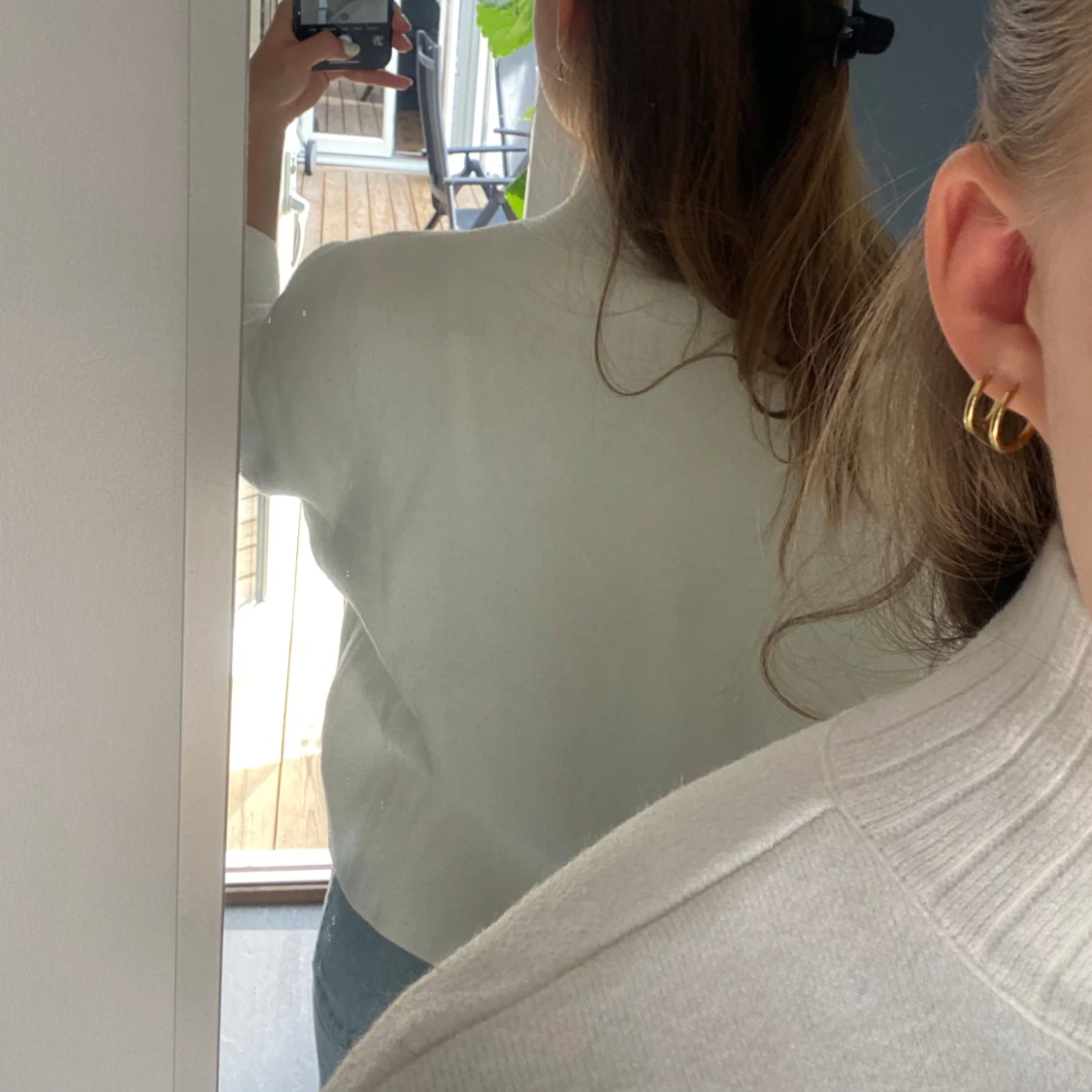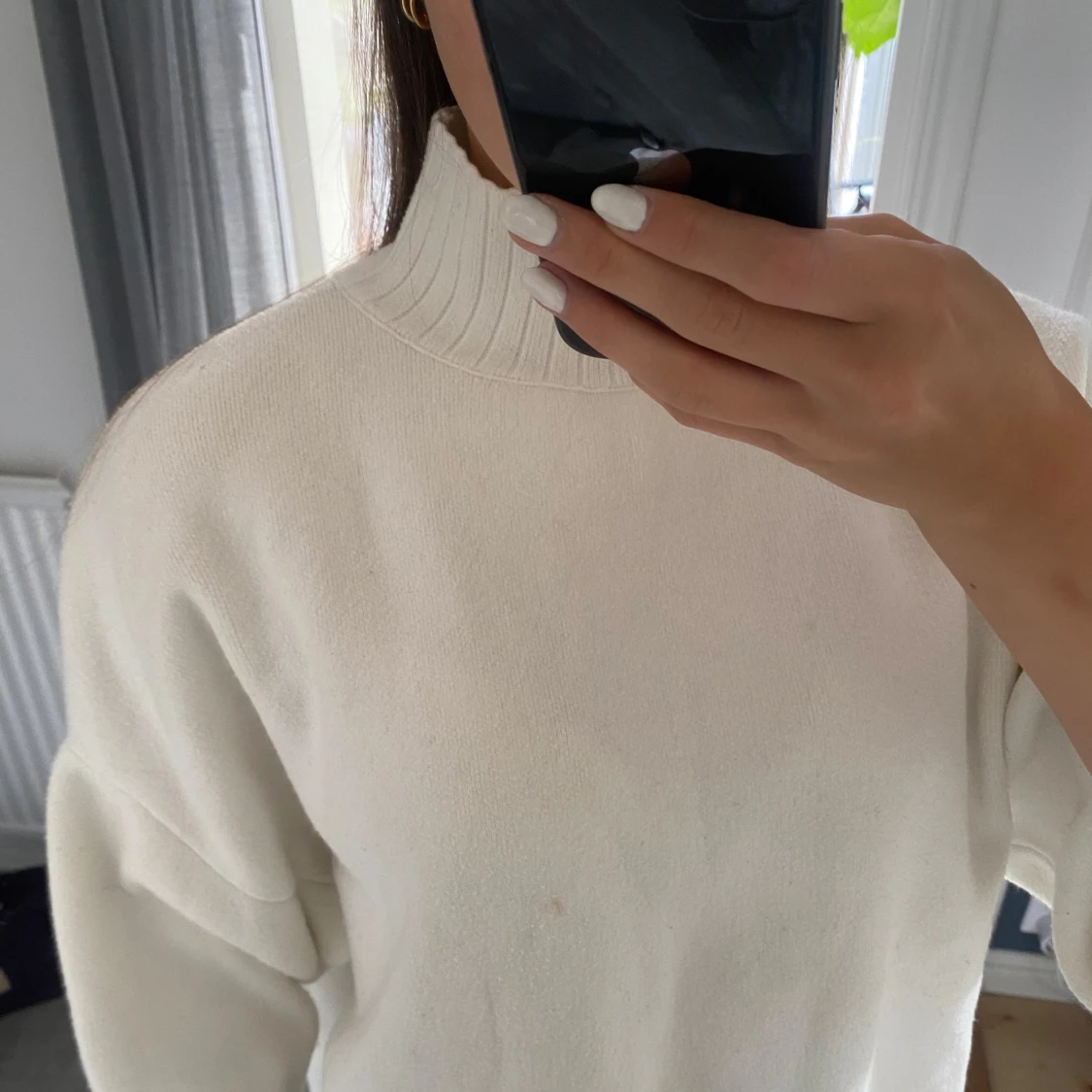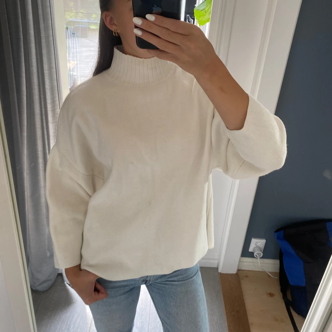 Vit stickad polotröja med hög ribbad krage och avslappnad, loose passform. Tröjan har raka, lite kortare ärmar och två små smuts fläckar på framsidan som säkert går bort i tvätten
