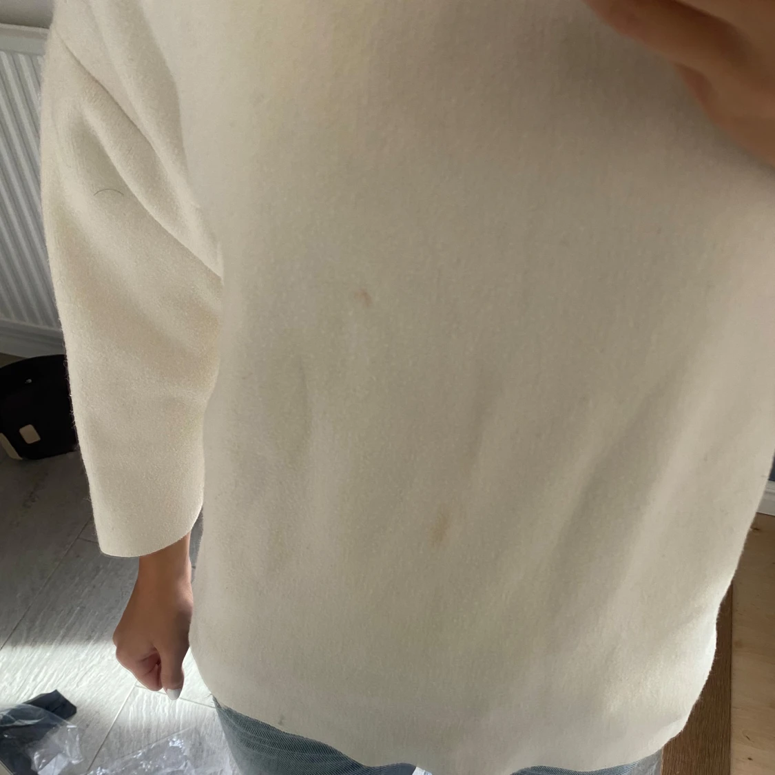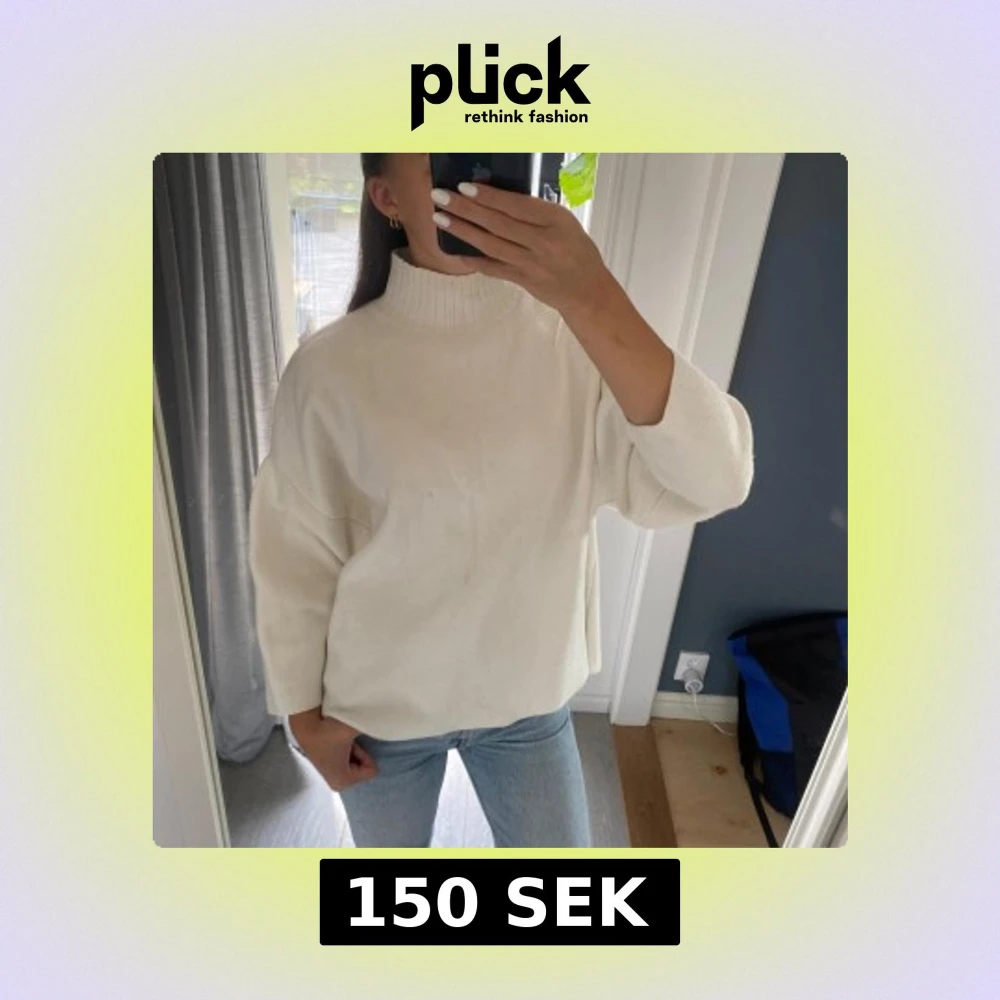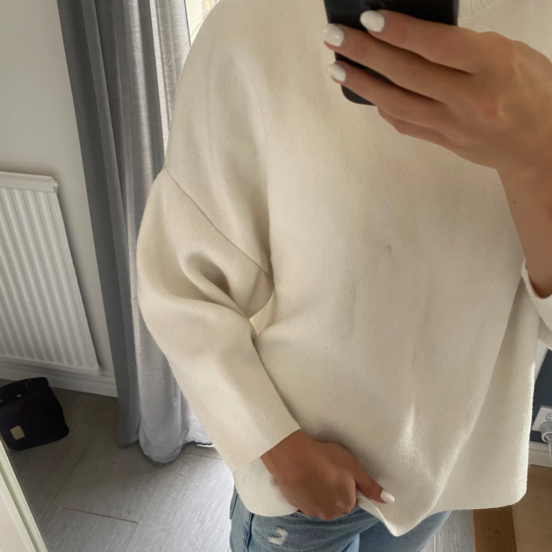 Vit stickad polotröja med hög ribbad krage och avslappnad, loose passform. Tröjan har raka, lite kortare ärmar och två små smuts fläckar på framsidan som säkert går bort i tvätten