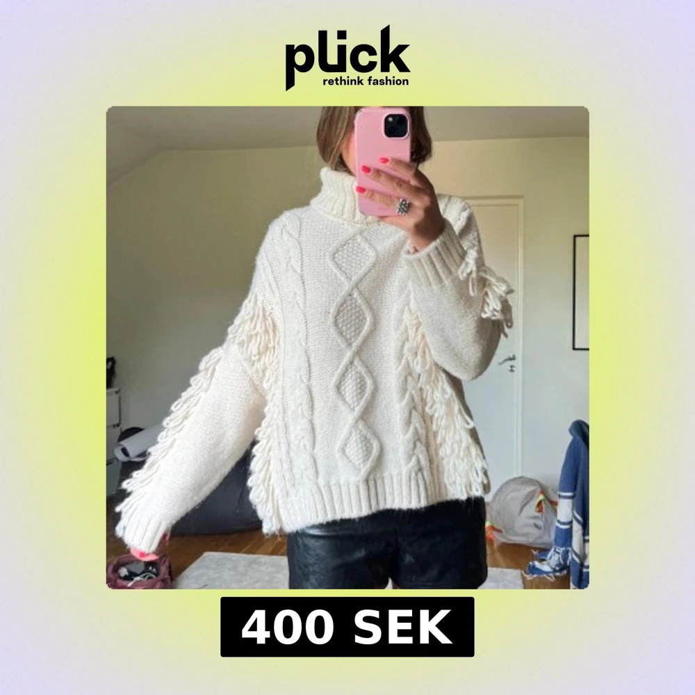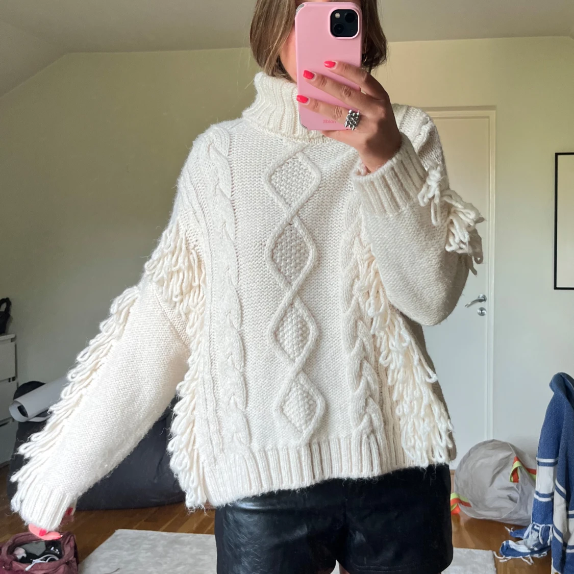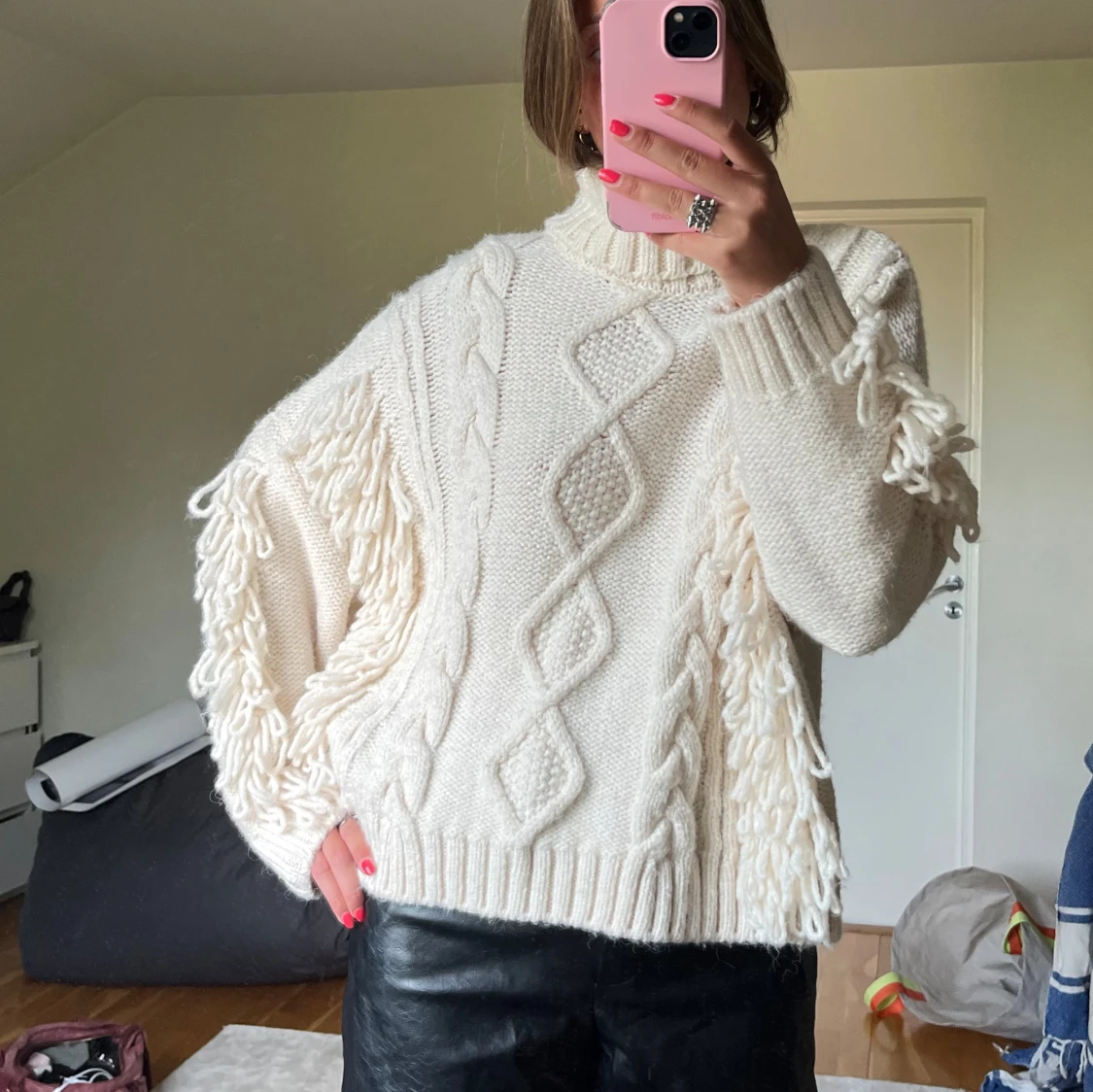 Supermysig vit stickad polotröja med flätstickade detaljer och fransar längs ärmarna. Oversized passform.
