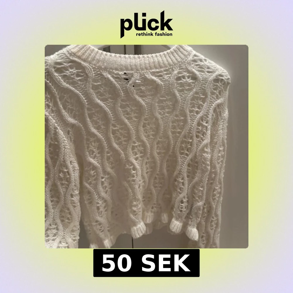 Säljer en vit stickad tröja från HM i storlek S. Tröjan har ett vågigt hålmönster och ribbade muddar vid hals, ärmslut och nederkant. Tröjan har en liten sminkfläck man kan försöka få bort den innan jag skickar! Skriv för mer💕