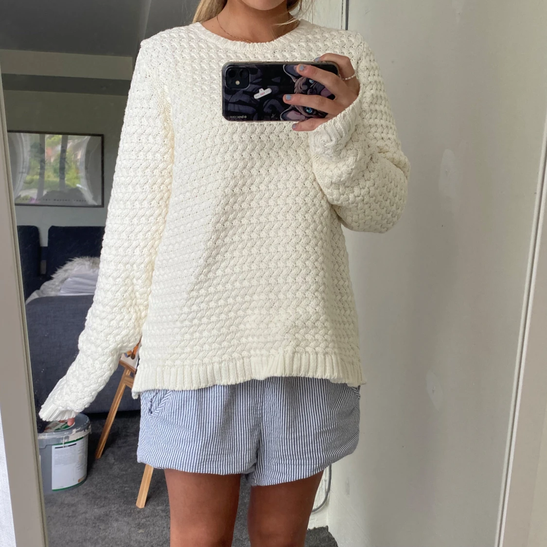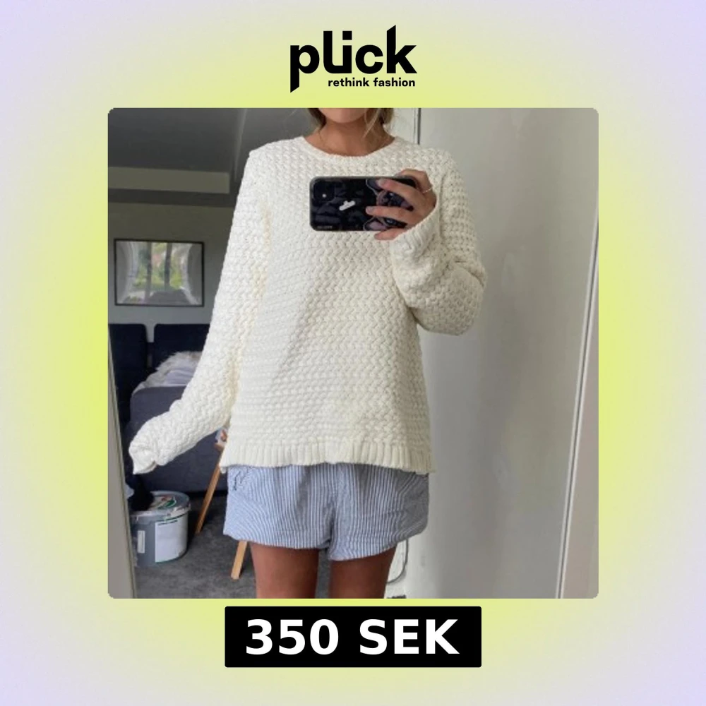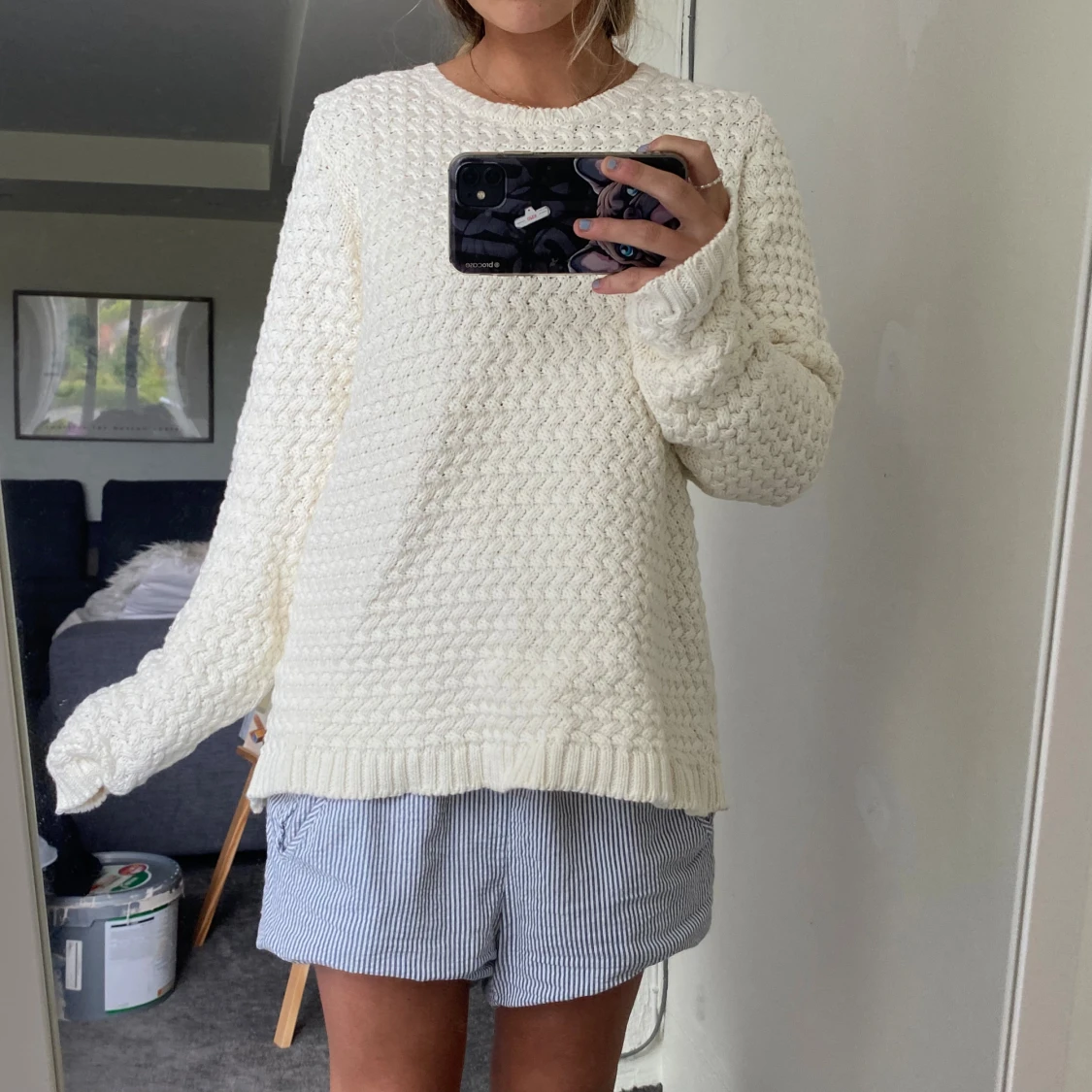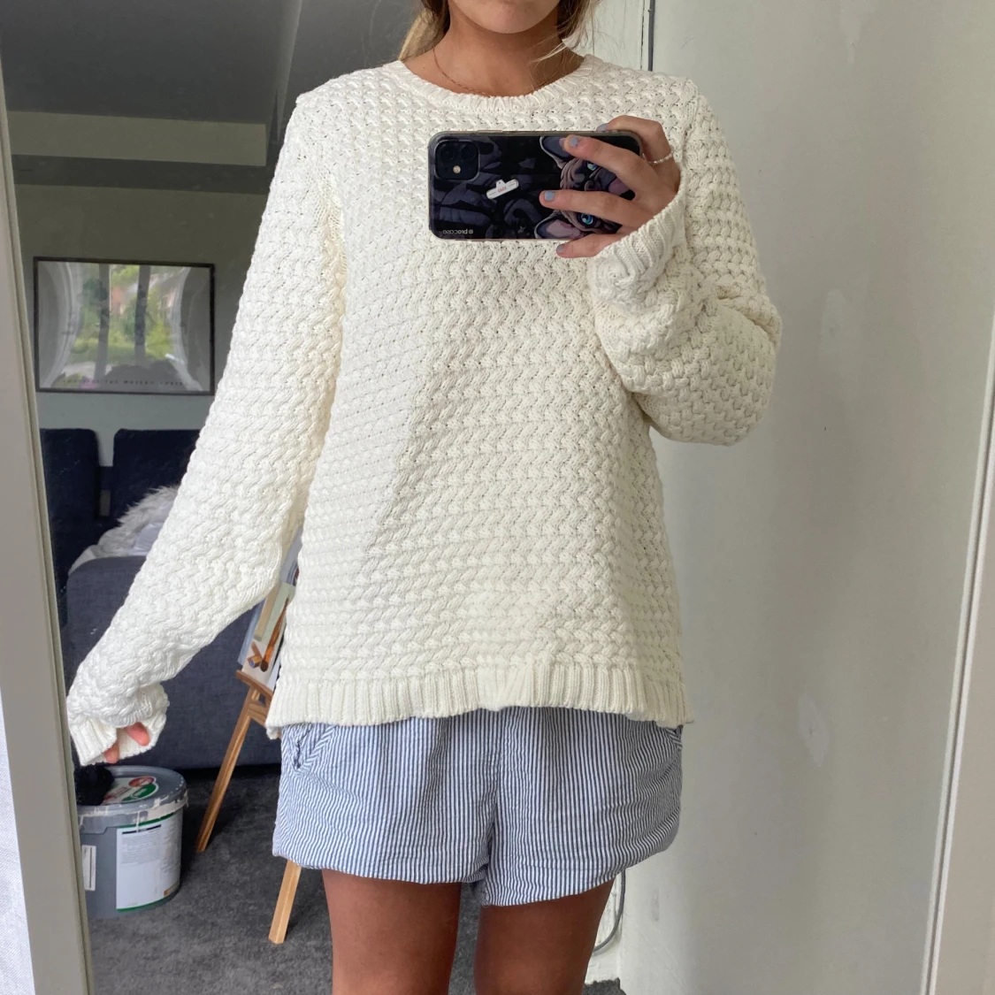 Mysig vit stickad tröja med grovt strukturmönster och rund hals. Tröjan har långa ärmar och ribbade muddar vid ärmslut och nederkant. Perfekt för lager-på-lager och chill dagar.