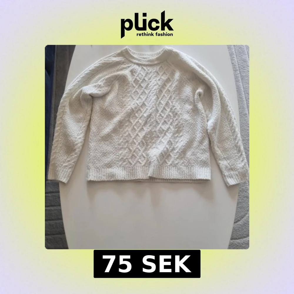 Mysig vit stickad tröja från 157 med snyggt kabelstickat mönster framtill och ribbade muddar. Perfekt för kyliga dagar och passar till allt. Klassisk rund halsringning och långärmad modell.