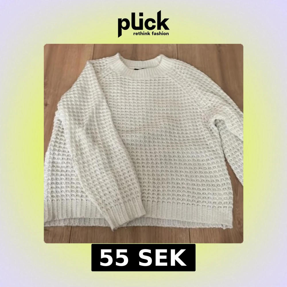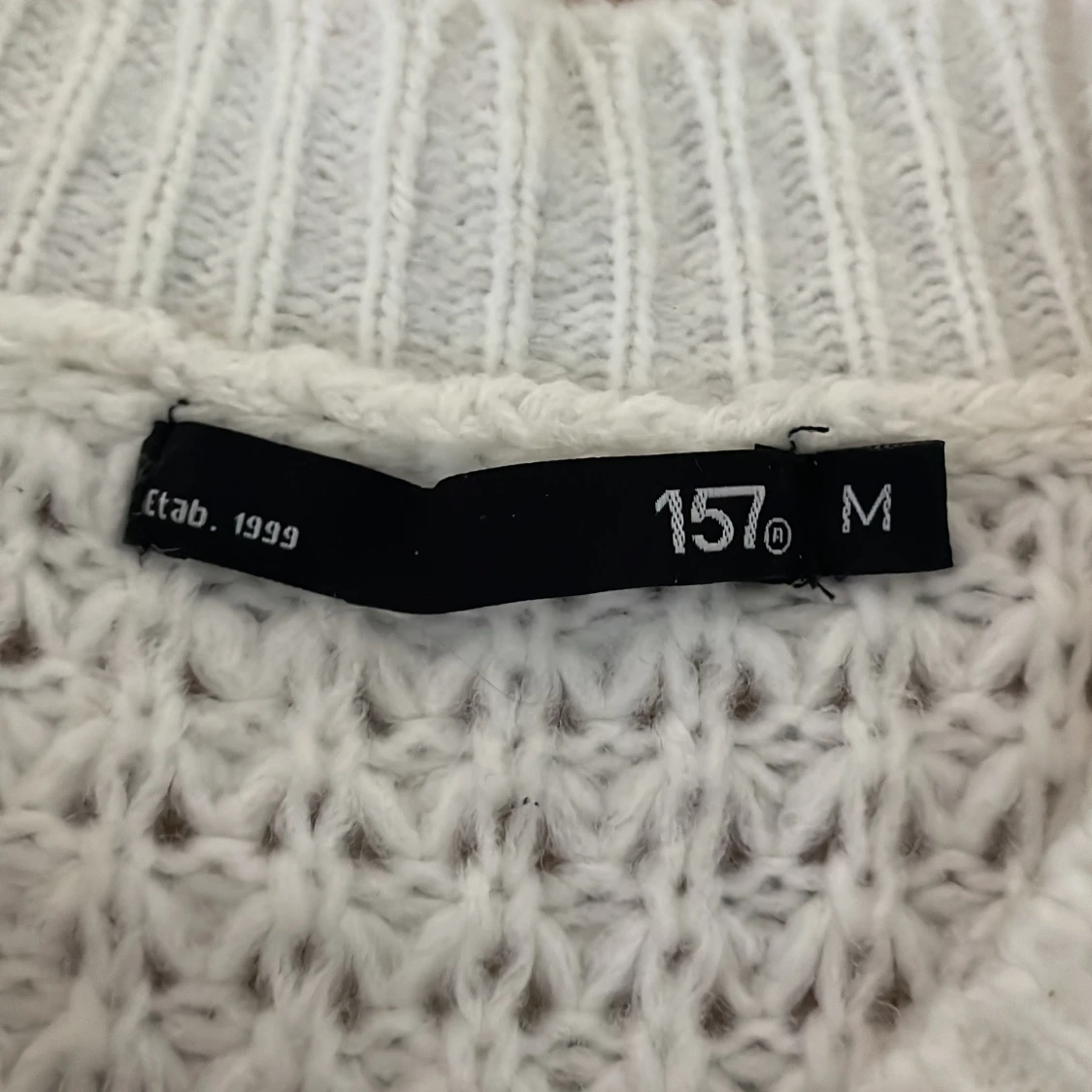 Säljer en vit stickad tröja från 157 i storlek M. Tröjan har ett snyggt strukturerat mönster och ribbade muddar vid ärmslut, halsringning och nederkant. Perfekt för kyliga dagar och enkel att matcha med olika outfits.