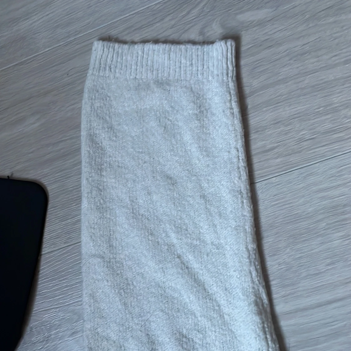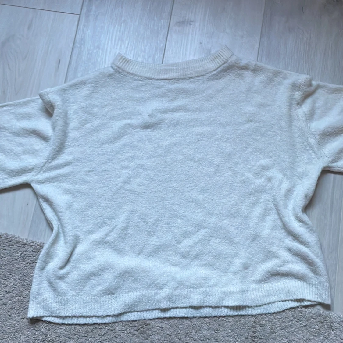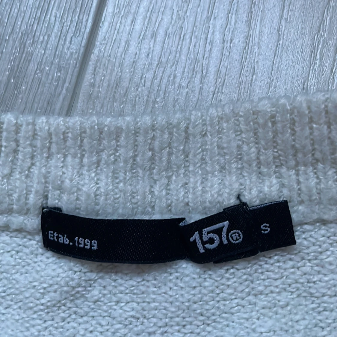 Säljer en mysig vit stickad tröja från 157. Tröjan har en klassisk design med ribbad krage och långa ärmar. Perfekt för kyligare dagar. Passar bra till jeans eller kjol för en avslappnad look.