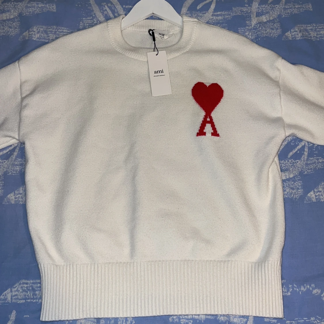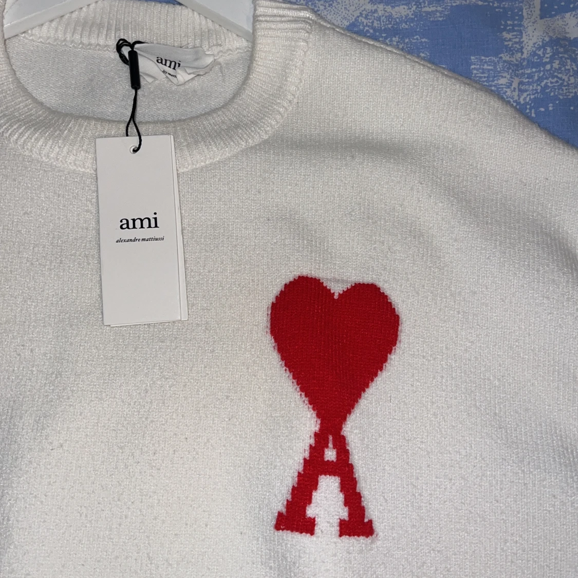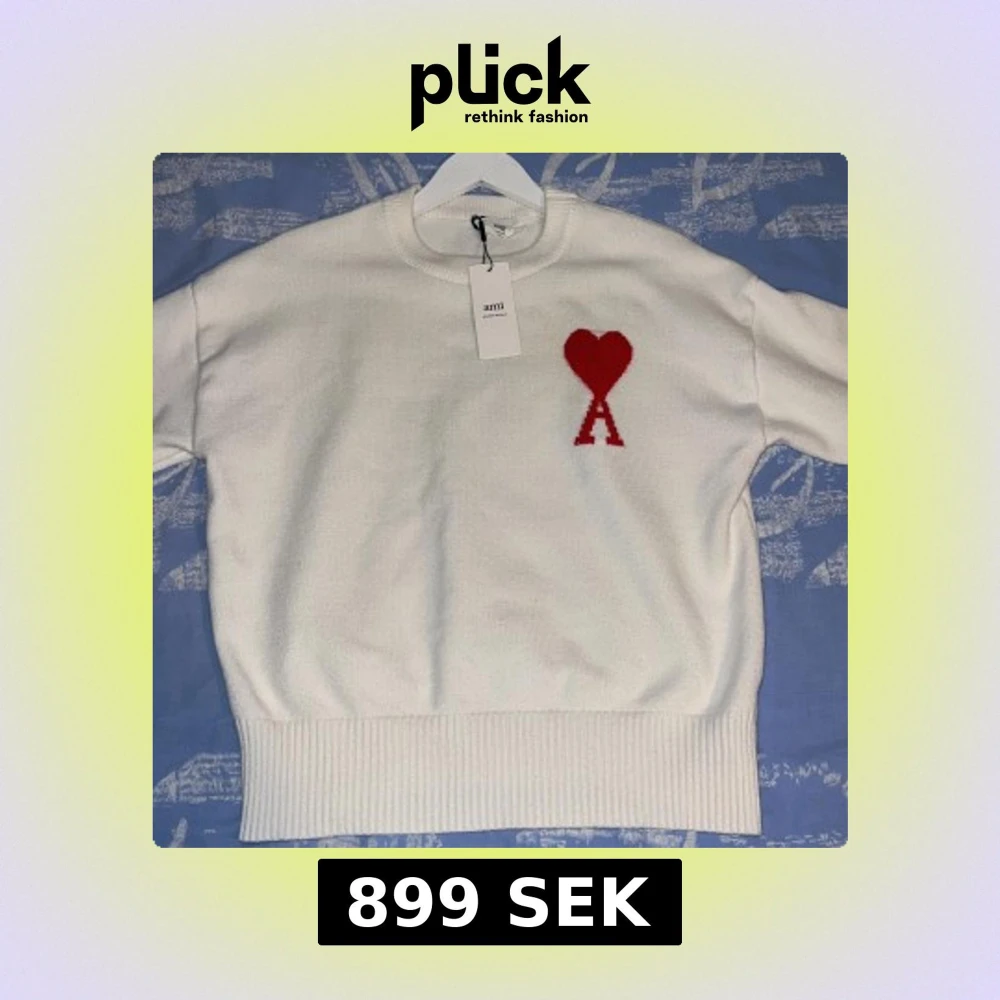 Vit stickad tröja från Ami Paris med röd hjärtlogga och A på bröstet. Tröjan har rund hals, ribbade muddar och en klassisk passform. Perfekt för dig som gillar stilrena plagg med en twist.
