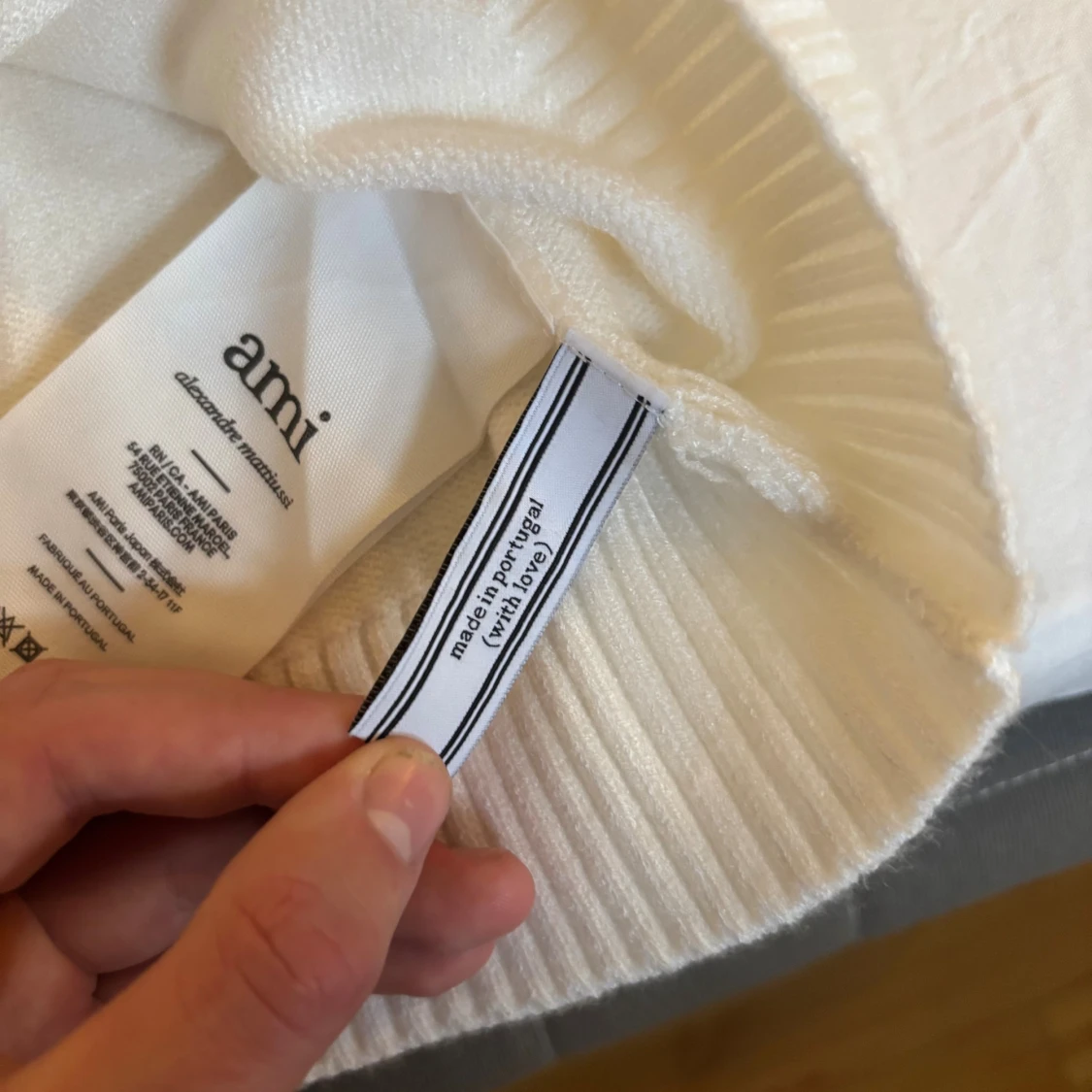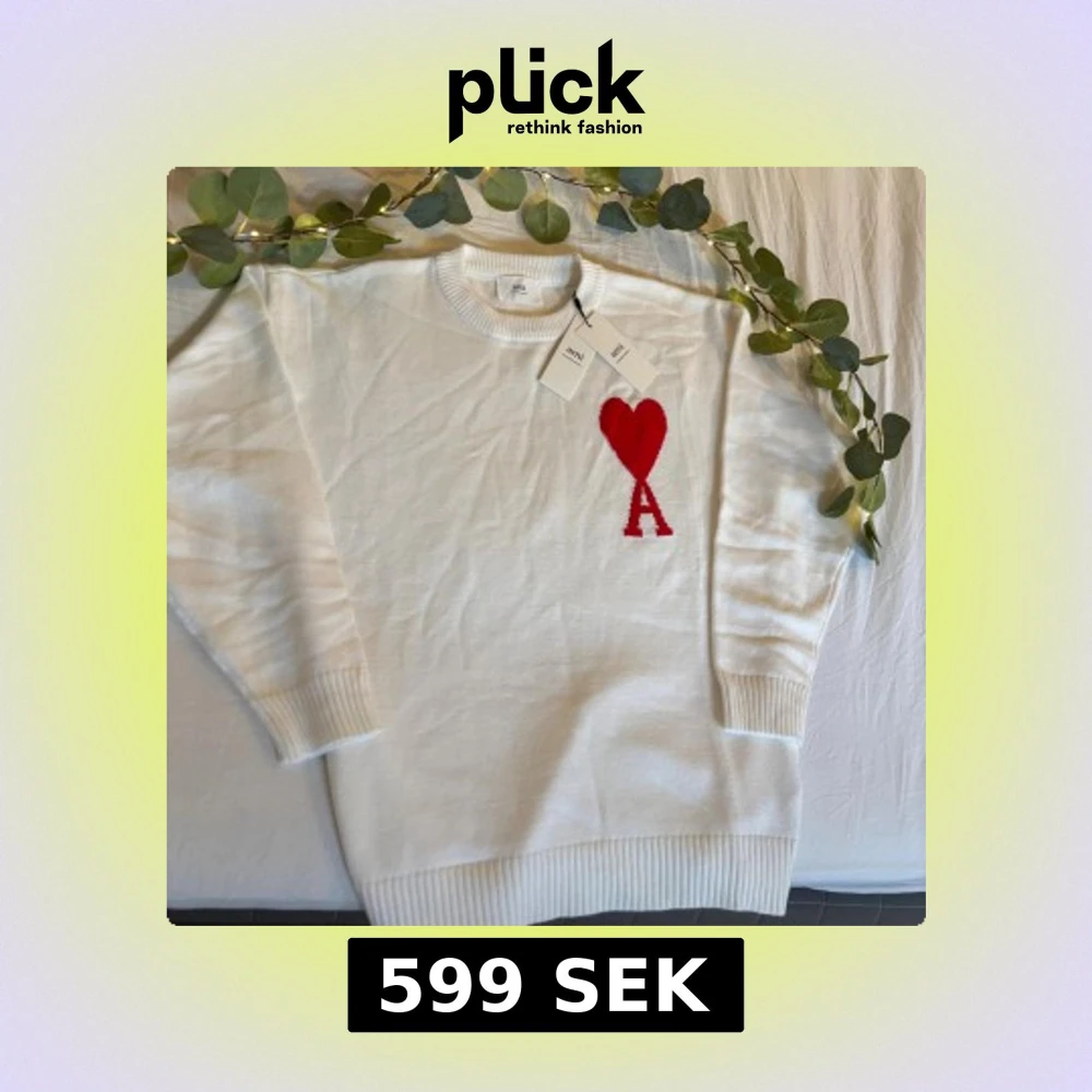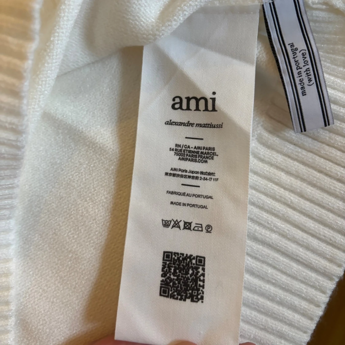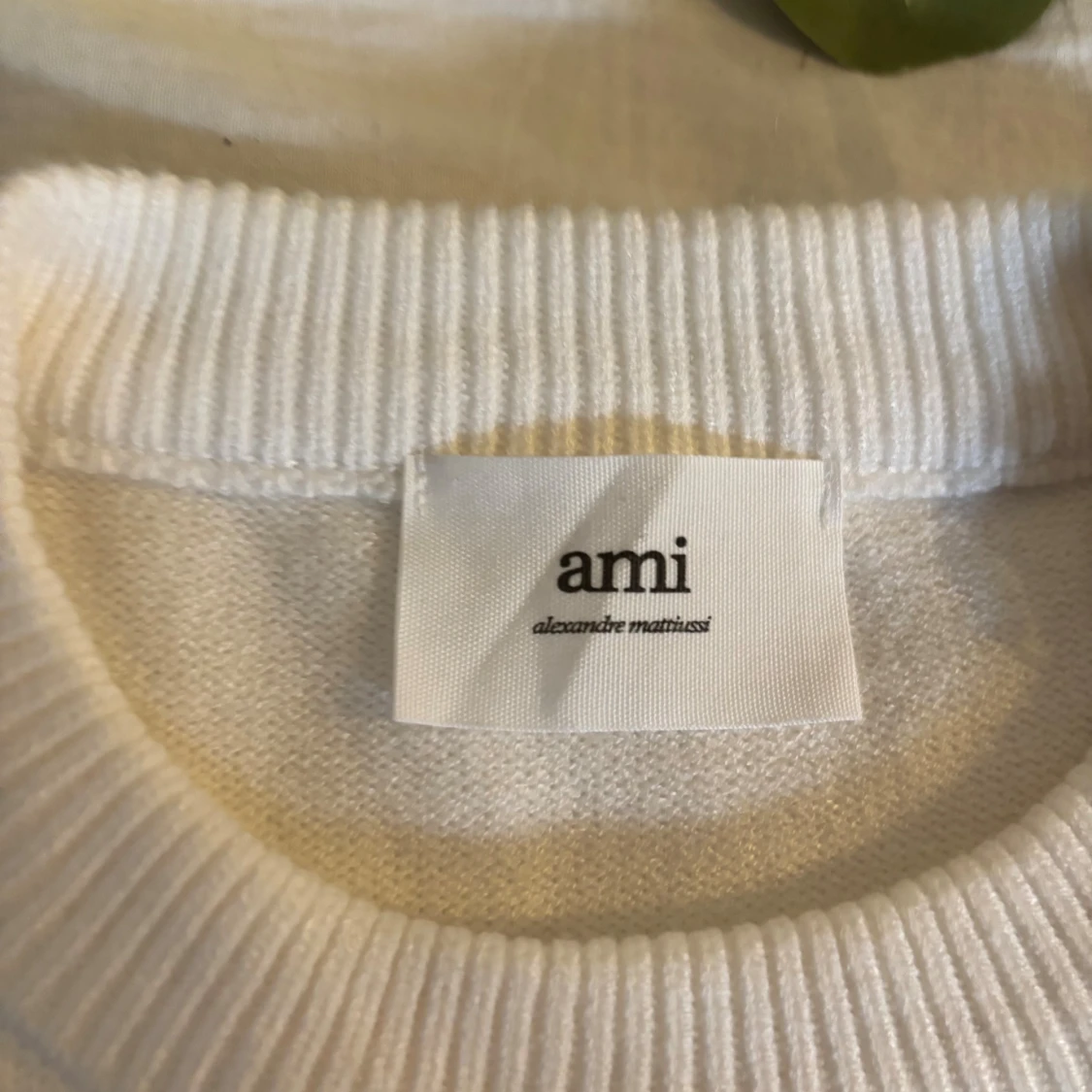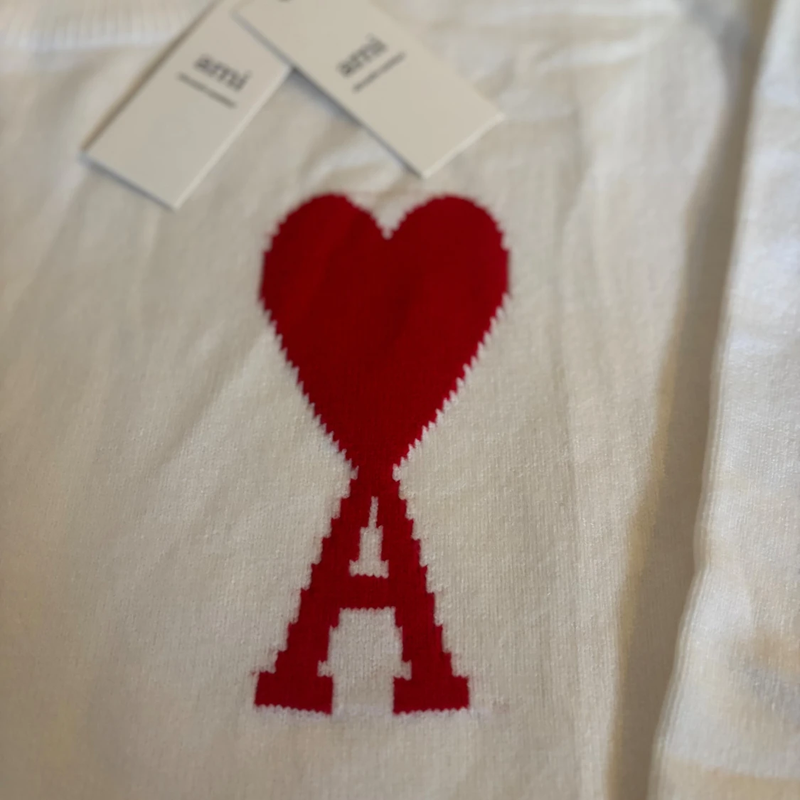 Vit stickad tröja från Ami Paris med röd hjärtlogga och bokstaven A på bröstet. Tröjan har rund halsringning, ribbade muddar och är tillverkad i Portugal. Perfekt för dig som gillar stilrena och trendiga plagg med en twist.