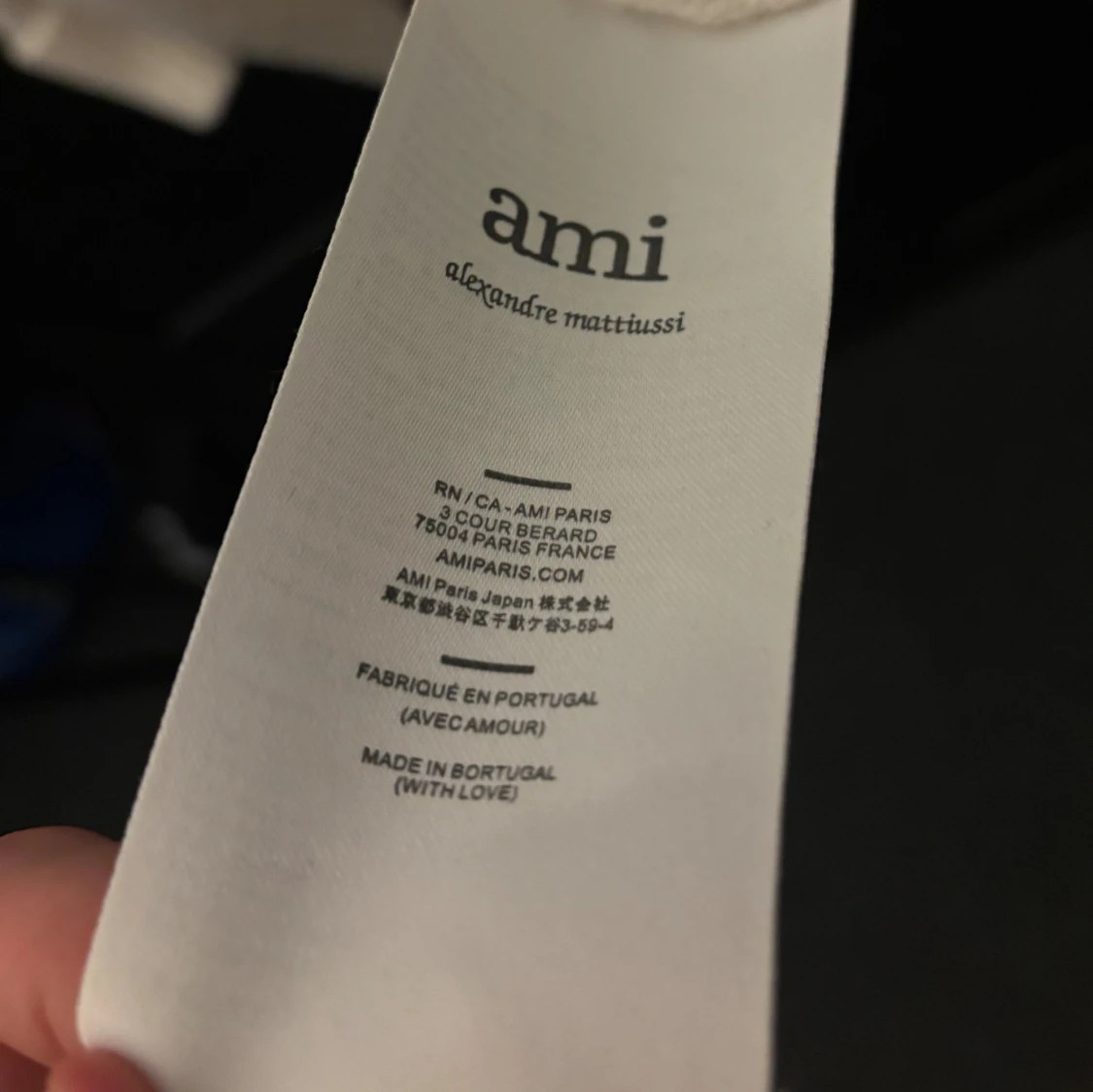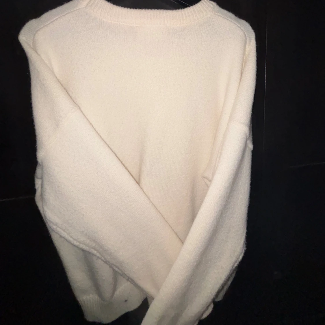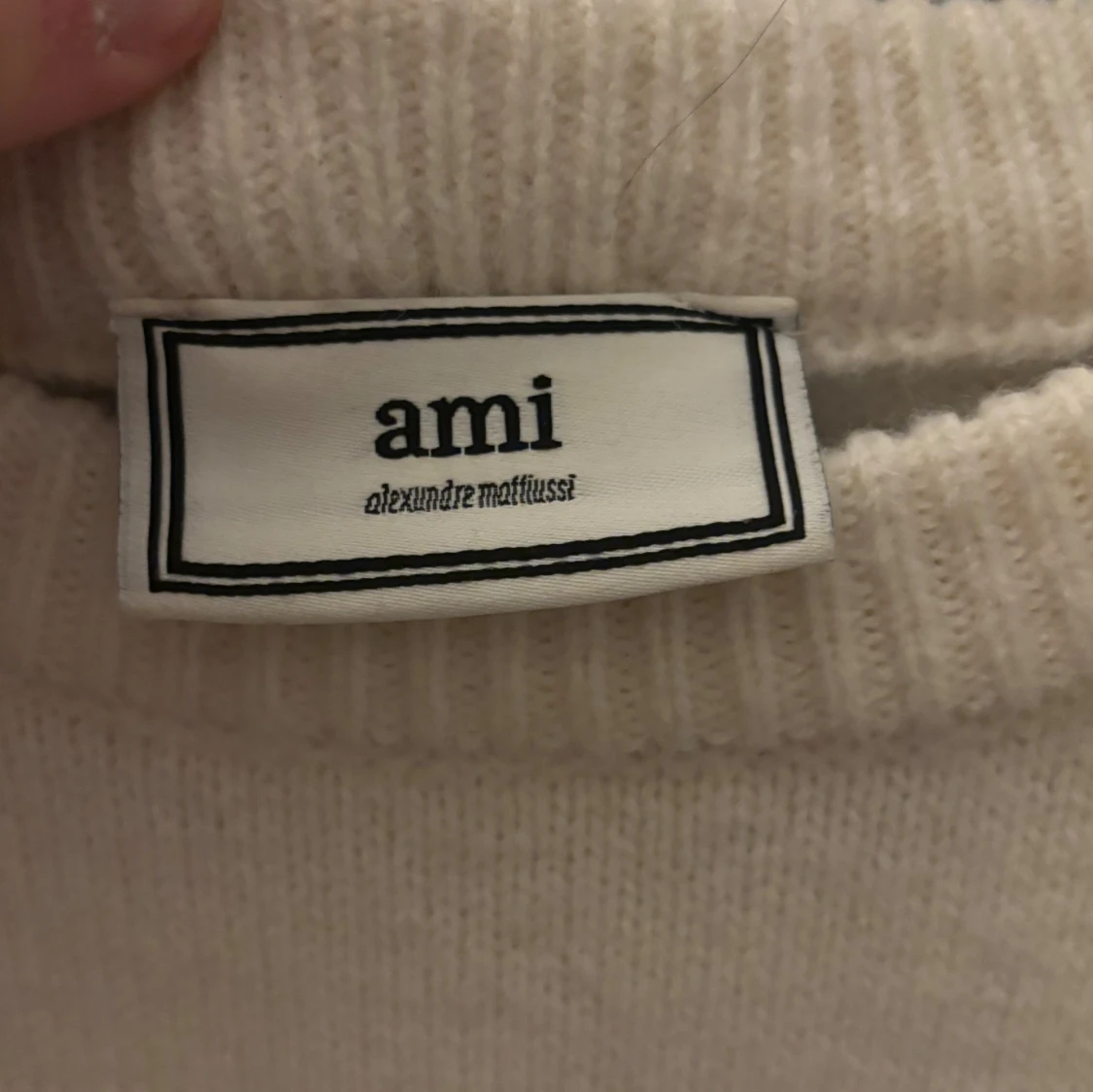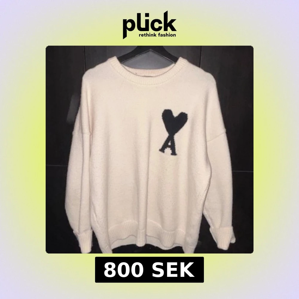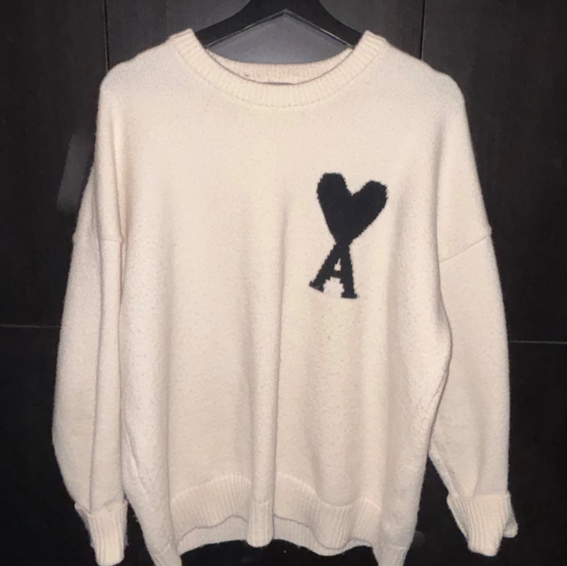 Säljer en vit stickad tröja från Ami Paris med svart hjärta och bokstaven A broderat på bröstet. Tröjan har rund hals, ribbade muddar och en loose passform. Perfekt för dig som gillar stilrena och trendiga plagg. Storleken är M, finns en enda liten defekt längst ner på tröjan som knappt är märkvärdig