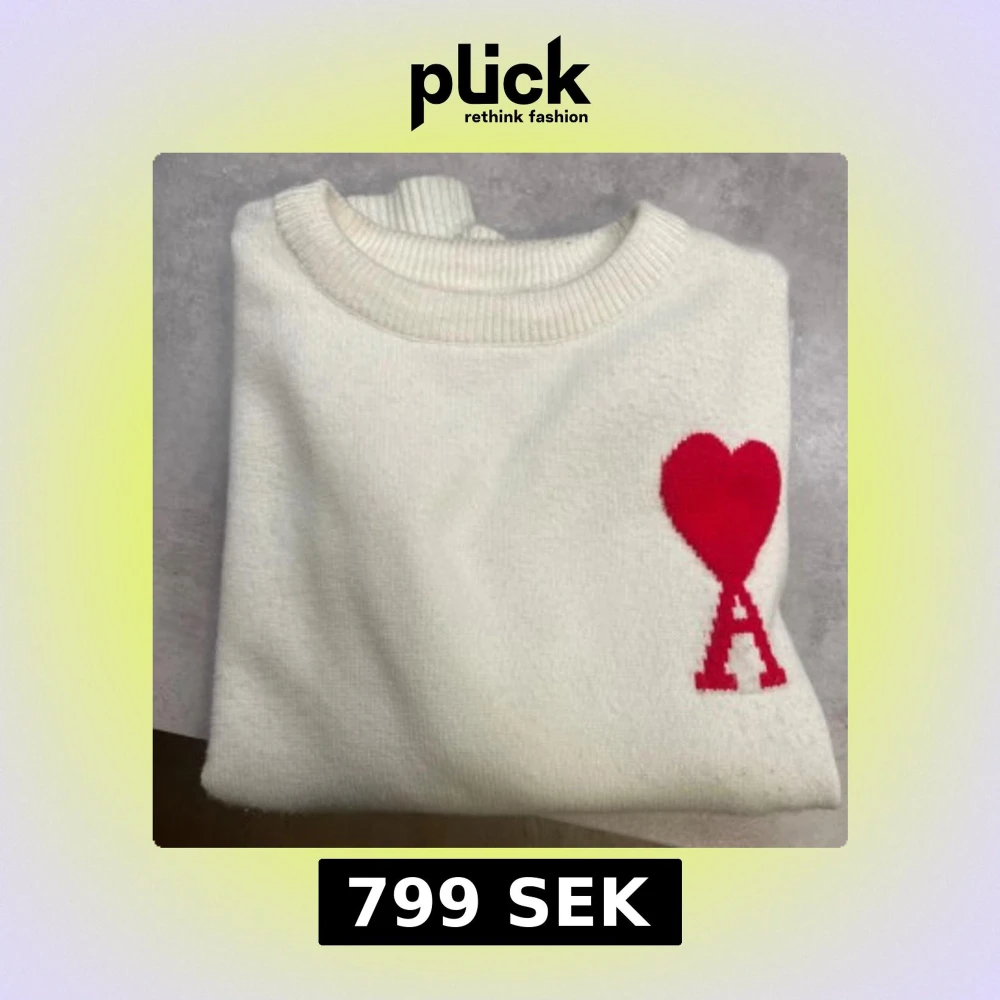 Vit stickad tröja från Ami Paris med röd hjärtdetalj och bokstaven A på bröstet. Rund hals med ribbade muddar vid ärmslut och nederkant. Mjuk och skön kvalitet, perfekt för dig som gillar stilrena plagg med en twist.