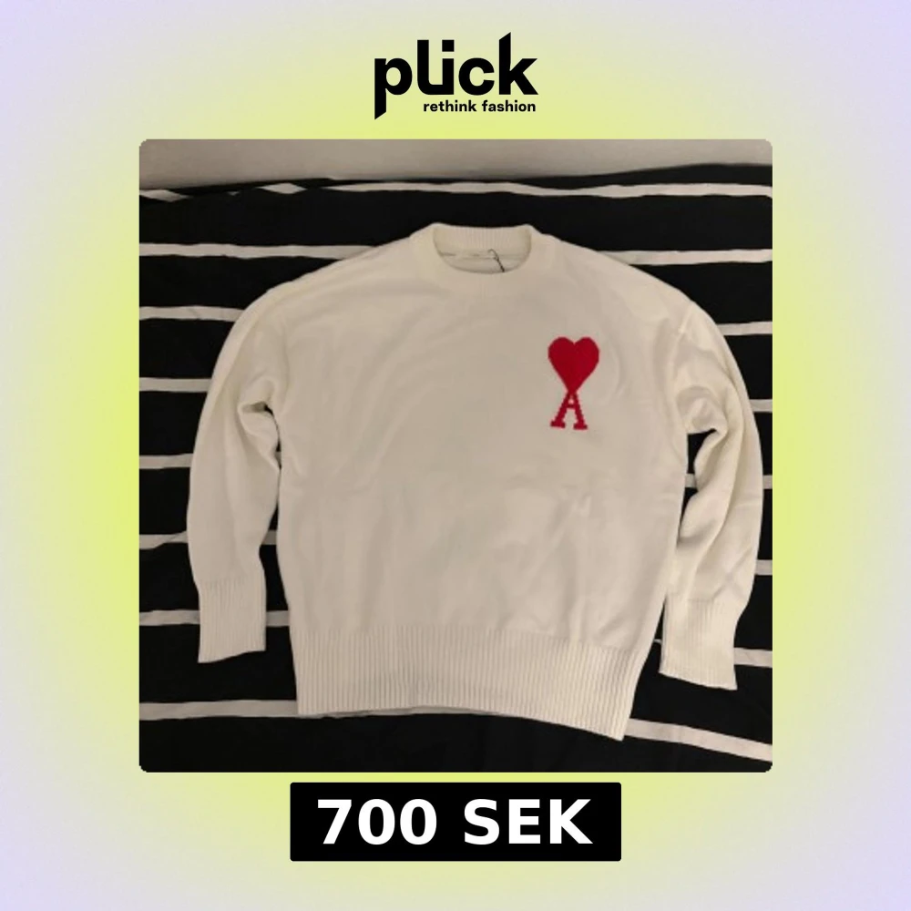 Säljer en vit stickad tröja från Ami Paris med ett rött hjärta och bokstaven A broderat på bröstet. Tröjan har rund halsringning och ribbade muddar vid ärmslut och nederkant. Perfekt för dig som gillar stilrena plagg med en twist. Kontakta för mer information.