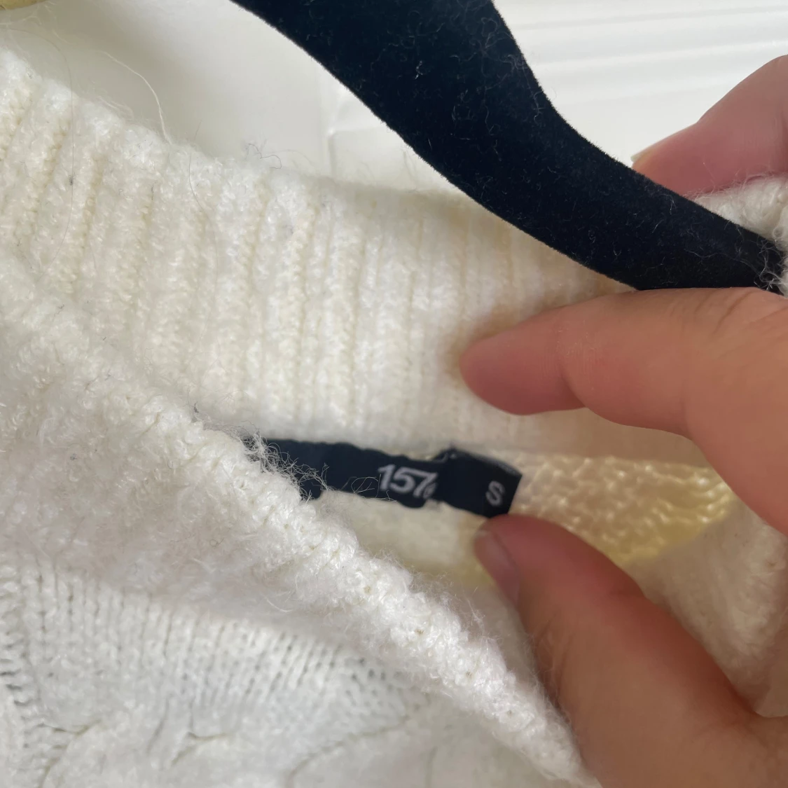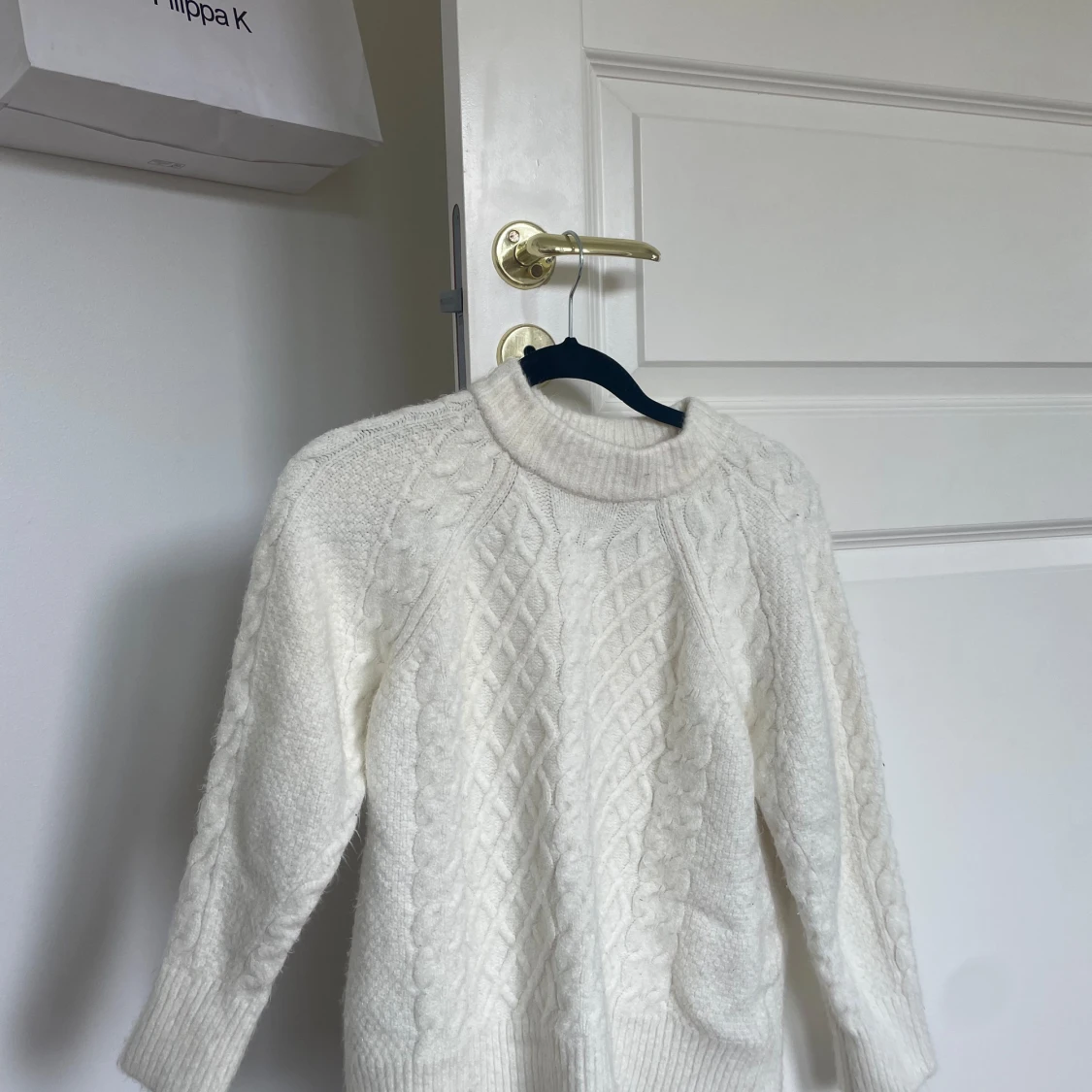 Säljer en superfin vit stickad tröja från Lager 157. Den har ett snyggt mönster och är perfekt för kyliga dagar. Tröjan har trekvartsärm och en bekväm passform. Perfekt för både vardag och fest! 🤍Storlek S men passar XS.